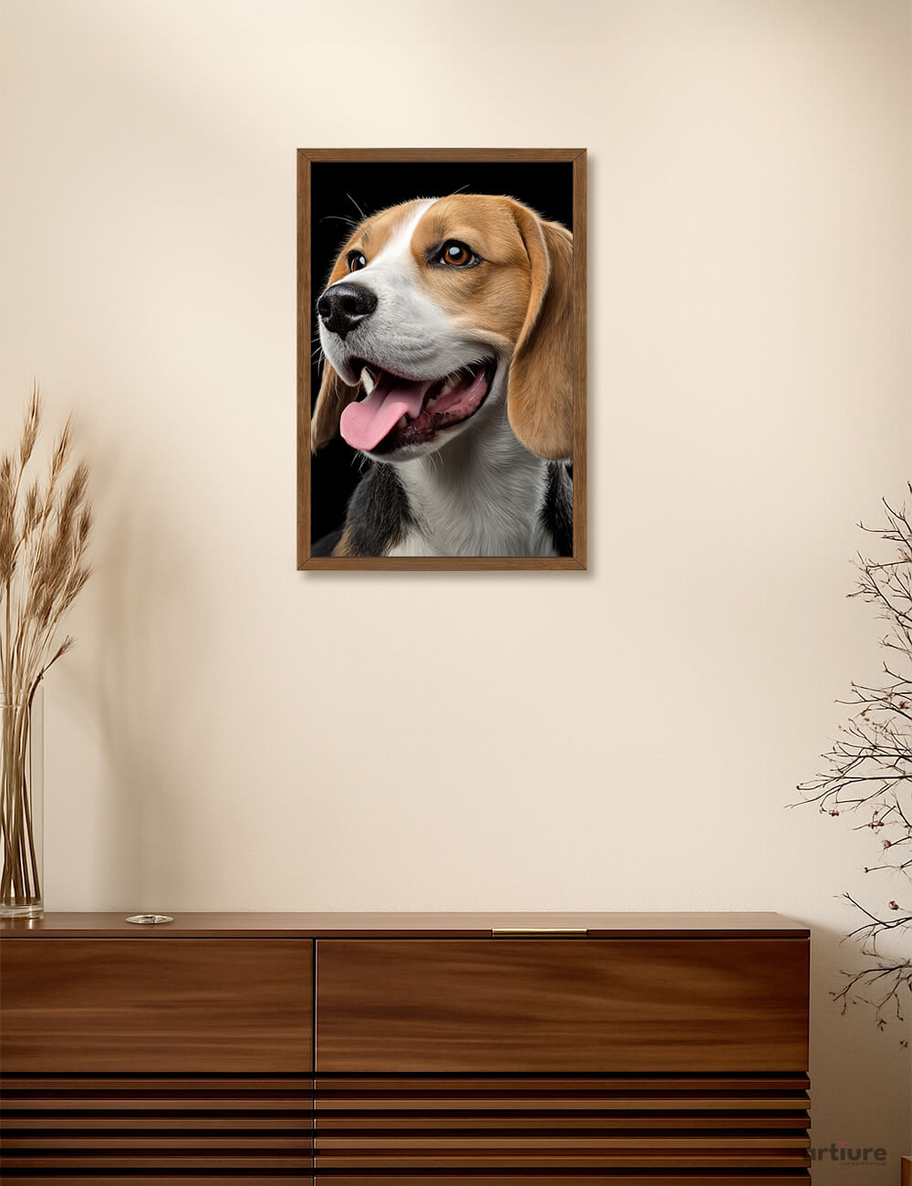 An endearing beagle portrait rendered as a high-quality art print, ready to elevate a warm corner of any living space. The photograph captures the dog's inquisitive eyes, wagging mouth, and glossy coat against a crisp dark backdrop, framed in a natural wood frame that complements the beige wall setting. This wall art print brings a touch of cheerful charm to living rooms, bedrooms, or pet-friendly spaces, inviting daily smiles. The composition emphasizes character and warmth, with rich browns, soft whites, and a living-room friendly palette that pairs with neutral interiors. Printed for sharp detail and lasting presence, it suits contemporary and cozy decor alike, offering a timeless, pet-inspired focal point.