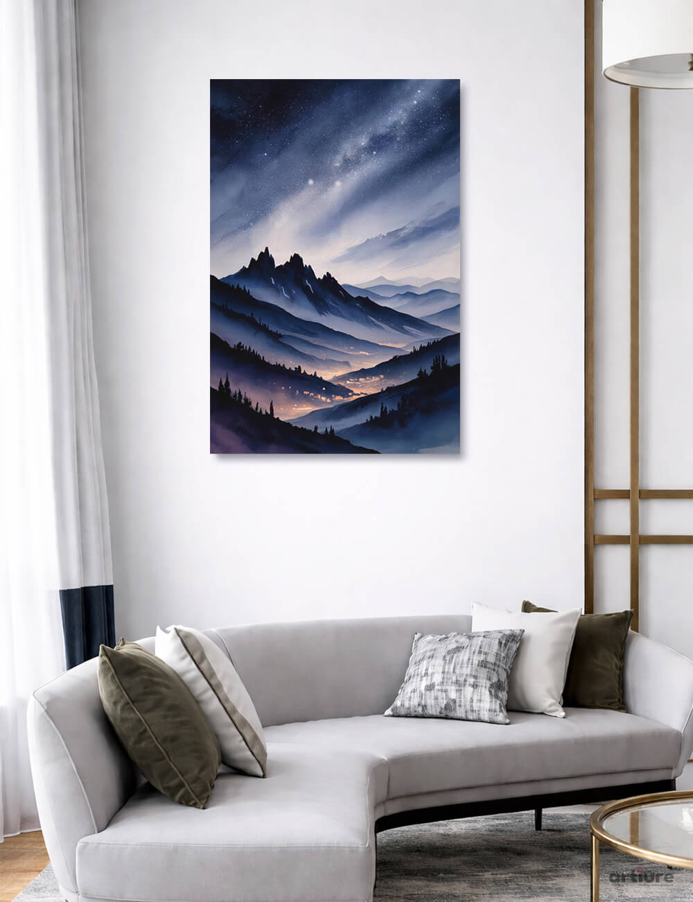 This canvas print presents a spine of jagged peaks cutting across a velvet night sky, with layered ridges receding into pale lavender and midnight blues. A gentle dreamlike glow spills from towns tucked in the valley, warming the lower slopes with amber and soft orange. The composition guides the eye from the starry heavens down through misty bands of hills to a quiet village suggestion, balancing negative space and luminous tone. The piece harmonizes cool tones with a touch of warmth, making it versatile for contemporary living rooms, bedrooms, or creative workspaces. Ideal for modern interiors seeking serenity and subtle drama.