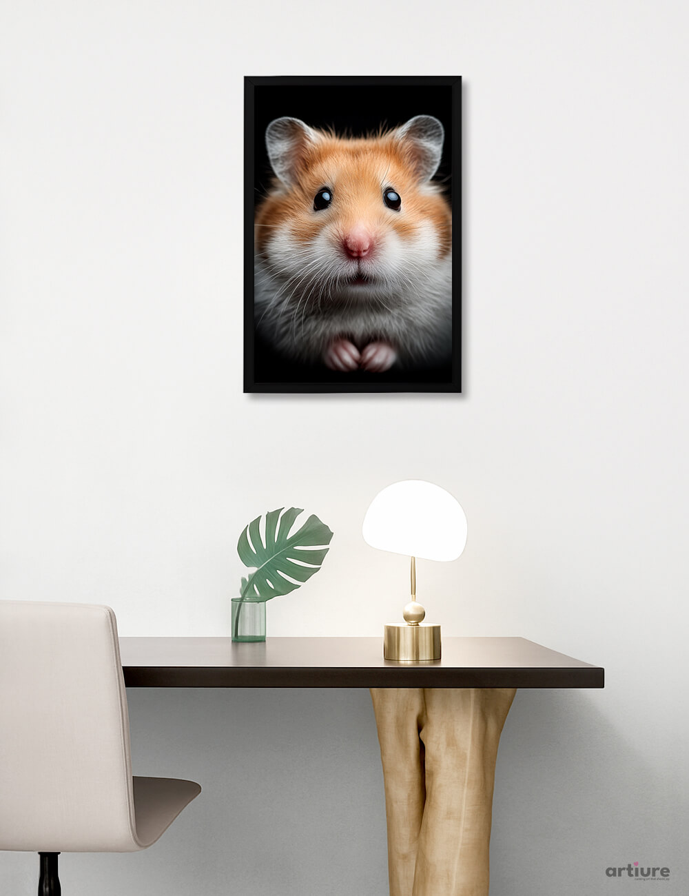 An endearing close-up of a hamster, its soft golden-brown fur and pale whiskers peeking from a dark, studio-black background. The glossy black frame centers the creature, drawing the eye to its large, soulful eyes and tiny pink nose. The print rests in a minimal office nook: a sleek desk, a single green Monstera leaf in a glass vase, and a sculptural brass lamp that glows with quiet, modern warmth. This art print blends playful charm with contemporary design, offering a friendly focal point that lightens any wall without shouting for attention. Ideal for living rooms, home offices, or bedrooms seeking a touch of whimsy and warmth.