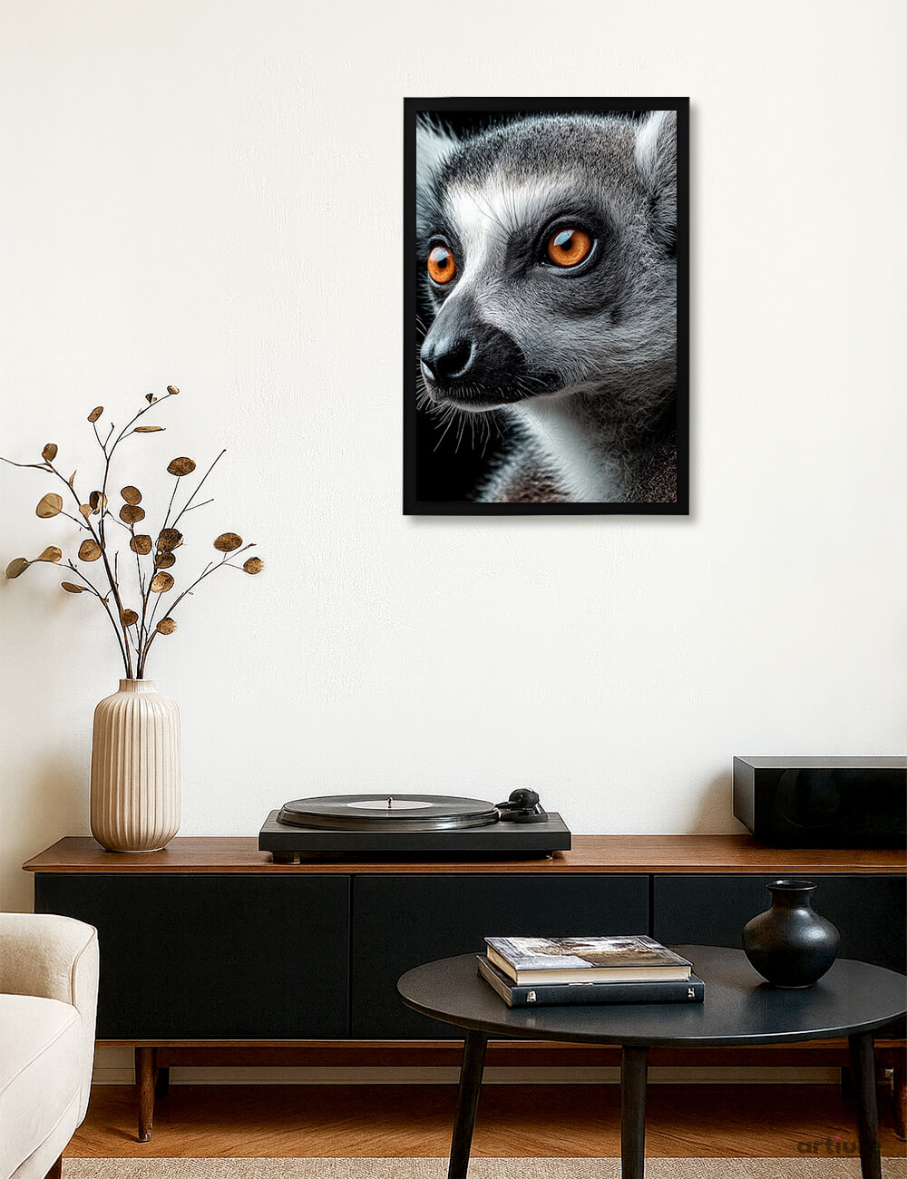 This portrait of lemur presents the ring-tailed lemur in an intimate close-up that draws attention to its expressive eyes and refined facial detail. The warm amber tones contrast beautifully with cool gray fur, creating depth, character, and visual tension. Soft, directional lighting enhances texture while preserving a natural, contemplative mood. This artwork celebrates curiosity, awareness, and the delicate balance of life in the wild. The close perspective fosters connection, inviting viewers to pause and observe rather than simply look. Ideal for modern interiors, wildlife collections, or educational spaces, this fine art print brings energy, intelligence, and a sense of wonder inspired by one of nature’s most charismatic primates.
