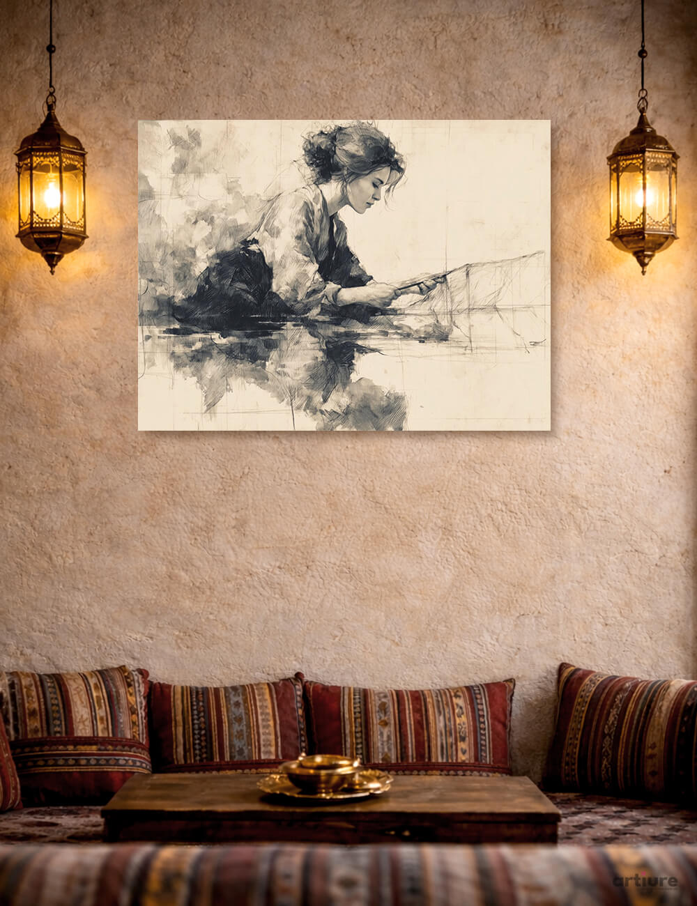 Patience Takes Shape portrays a woman absorbed in the act of making, rendered through fluid monochrome strokes and reflective textures. The artwork honors the unseen hours behind every creation, the calm, the repetition, the devotion. It is a tribute to process over outcome, to stillness over noise. A contemplative canvas that brings depth, focus, and gentle discipline into any space.