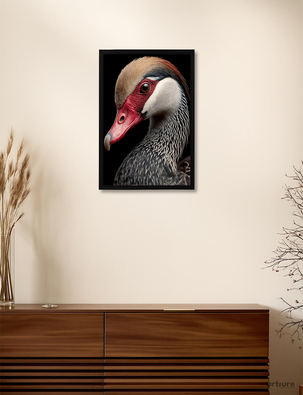 This art print portrait highlights a Red-Beaked Anseriformes bird, celebrating the elegance and calm strength of waterfowl shaped by wetlands and open waters. The vivid red beak stands in striking contrast to soft plumage, drawing attention to both form and character. Known for steady movement and strong social bonds, these birds symbolize harmony, adaptability, and rhythm within nature. The artwork captures a moment of poised stillness, where reflection replaces motion. Fine details emphasize texture and balance without excess. More than a wildlife portrait, this piece evokes tranquility and natural order. Ideal for serene interiors, nature lovers, and collectors drawn to water-inspired calm and understated beauty.