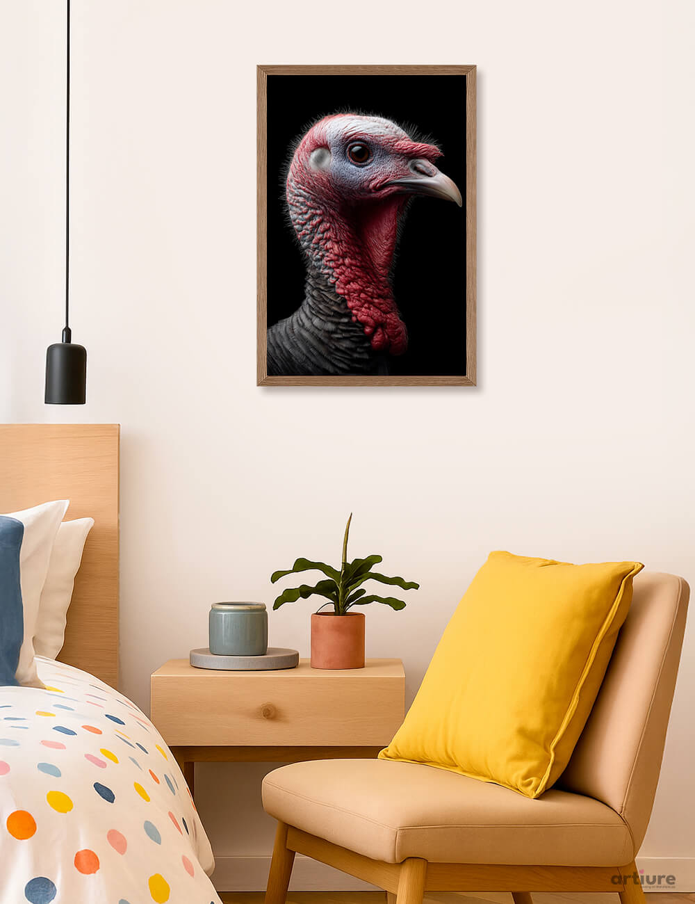 This fine art print captures the wild turkey in an intimate side-profile, highlighting remarkable textures and expressive detail often overlooked in this iconic bird. The layered skin tones of deep red and slate grey create a sculptural quality, while the sharp beak and steady eye convey alert intelligence and quiet authority. Set against a dark background, the portrait feels bold, contemporary, and timeless. Symbolizing abundance, resilience, and connection to the land, the wild turkey carries cultural and natural significance. Ideal for rustic-modern interiors, studios, and statement walls, this artwork transforms a familiar species into a powerful visual narrative of strength, heritage, and authentic wildlife beauty.