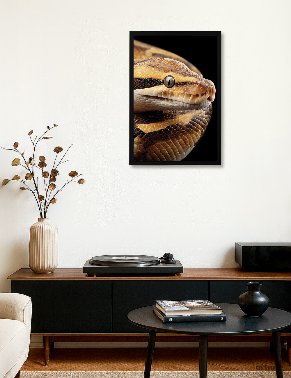 This portrait celebrates the quiet majesty of a python captured in a moment of poised stillness. Warm, golden hues flow across meticulously detailed scales, creating a rich rhythm of pattern and texture. Soft directional lighting enhances form without harsh contrast, allowing the subject to emerge gracefully from darkness. The coiled posture suggests balance, patience, and controlled power—energy held in reserve. This artwork transforms a primal creature into an elegant study of natural design and symmetry. Ideal for modern interiors, luxury spaces, or collector walls, the print brings warmth, intrigue, and a refined sense of wild beauty into any environment.