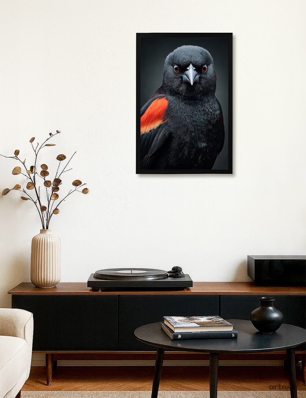 This fine art print captures the male red-winged blackbird in a powerful, front-facing composition that emphasizes contrast and presence. Deep black plumage absorbs light, allowing the vivid red and amber shoulder patch to glow with dramatic intensity. The bird’s direct stare creates an immediate connection, conveying alertness, dominance, and resilience. Subtle feather textures and refined lighting add depth and realism, transforming a familiar wetland species into a striking visual statement. Perfect for modern interiors, studios, and nature-inspired spaces, this artwork celebrates bold individuality and the raw beauty of wildlife, turning a fleeting moment into a timeless, collectible portrait of natural power and elegance.