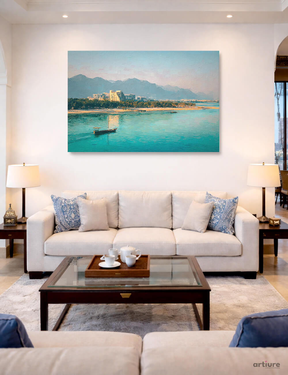 This canvas print portrays a coastal panorama where turquoise waters lap a sunlit shore beneath a pale, distant range. The painterly brushwork builds a soft, dreamlike atmosphere, with a solitary sailboat resting on the calm surface and a warm haze hugging the horizon. A muted palette of blues, teals, beiges, and greens creates a serene focal point that anchors a modern living room while echoing seaside memories. The composition balances expansive water with a reassuring skyline, offering a tranquil backdrop for conversation or quiet reflection. Rendered with impressionistic texture and contemporary clarity, it invites viewers to linger on the shimmer of light and the gentle motion of waves. Ideal for creating coastal elegance in lounges, foyers, or study corners.