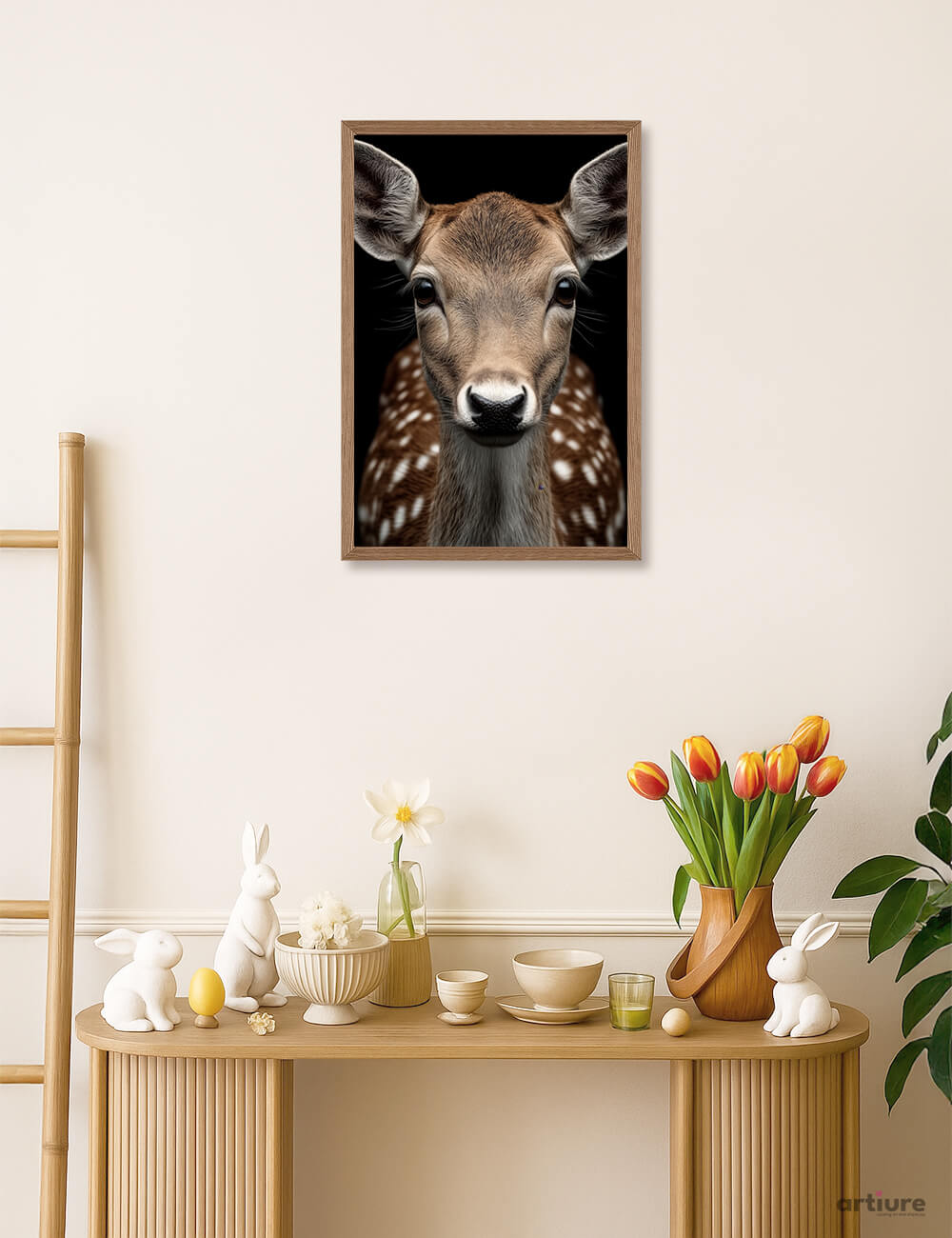 This portrait of a deer captures a young deer in a tender, front-facing portrait that feels calm, pure, and timeless. Fine fur, delicate markings, and wide, attentive eyes create an emotional connection rooted in innocence. The dark background isolates the subject, allowing warm natural tones to glow softly without distraction. Balanced composition and gentle lighting enhance texture while preserving simplicity. This artwork symbolizes new beginnings, vulnerability, and harmony with nature. Ideal for peaceful interiors, children’s spaces, or nature-inspired collections, the print brings warmth, serenity, and a sense of quiet wonder, inviting viewers to slow down, reflect, and appreciate life’s gentler rhythms everywhere always.