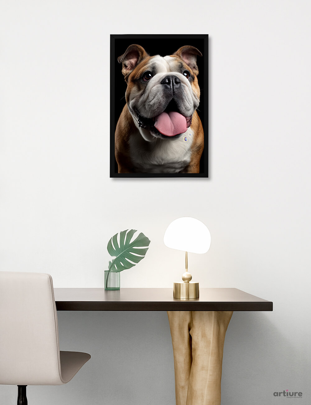 This photorealistic print captures a bulldog’s exuberant expression with lifelike detail and a glossy finish. Set against a black backdrop and mounted in a minimal black frame, the image brings warmth and personality to contemporary interiors. Printed as a premium giclée on heavyweight paper, it offers rich tones and subtle texture that enhance the dog’s tan, white, and chestnut fur. The clean white wall and a touch of gold from a modern lamp create a chic, balanced scene, while a hint of green foliage adds fresh contrast. Ideal for living rooms, home offices, or entryways, this companion portrait invites smiles and casual conversation. A timeless piece that celebrates loyal companionship and everyday joy.