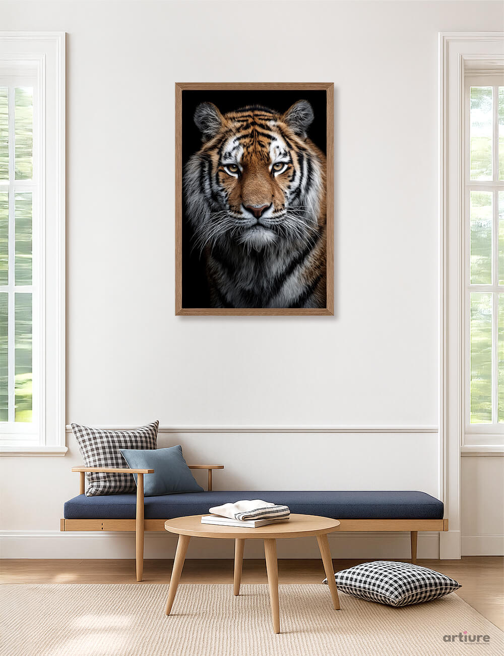 This portrait captures the Bengal tiger (panthera tigris tigris) in a moment of poised stillness, where strength is felt rather than shown. The frontal composition emphasizes piercing eyes, powerful facial structure, and the intricate rhythm of stripes—each one a mark of individuality and survival. Soft, controlled lighting enhances texture and depth while the dark background isolates the tiger’s presence, giving it a sculptural, timeless quality. This artwork symbolizes dominance balanced by restraint, awareness sharpened by instinct, and confidence rooted in nature’s order. Ideal for statement interiors, modern spaces, or curated wildlife collections, this art print commands attention while honoring the quiet mastery of one of the wild’s most iconic predators.