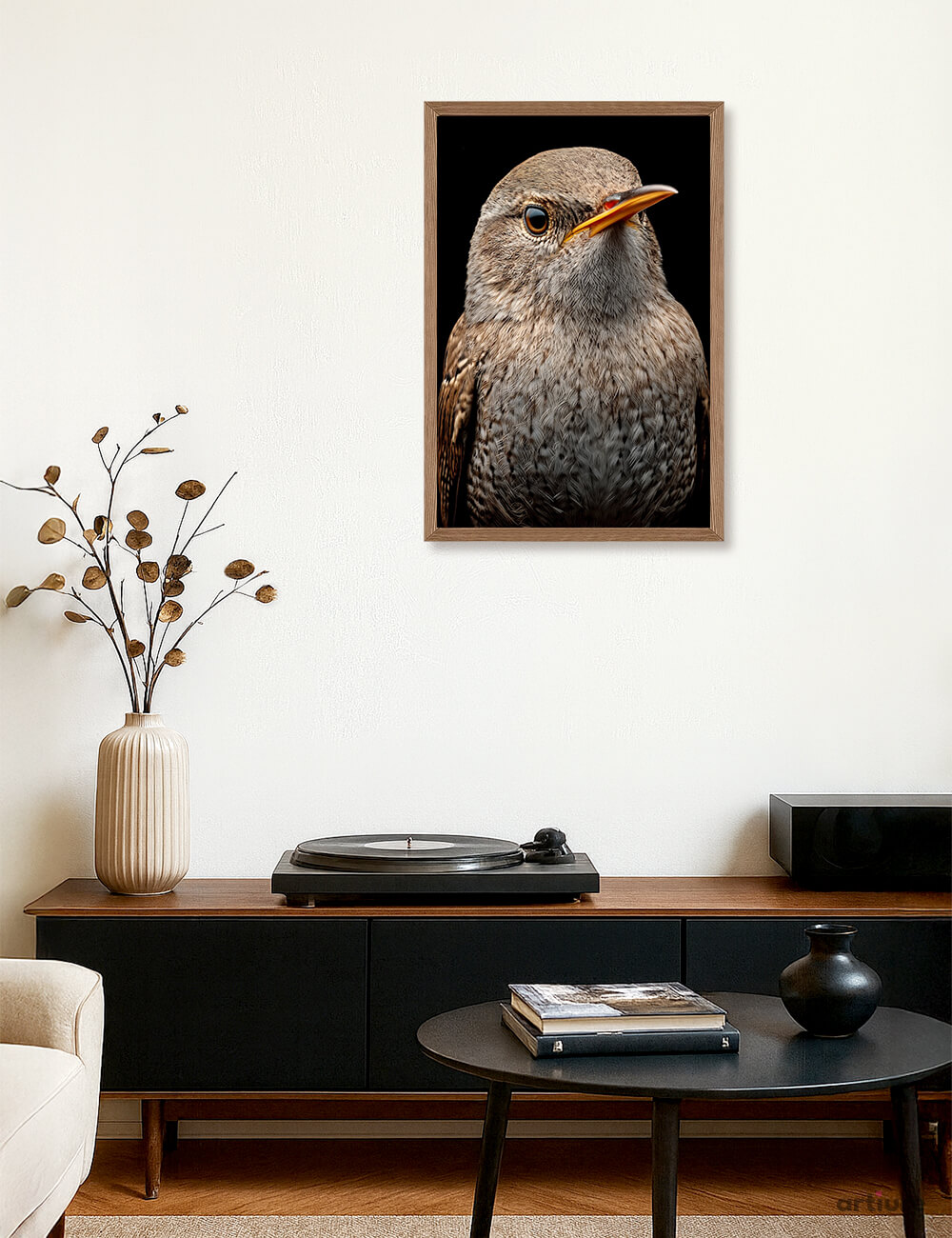 This art print portrait highlights the Northern House Wren, a bird admired for its energetic nature and surprisingly strong song. Despite its small size and subtle brown tones, the wren carries an outsized presence through constant motion and confident vocal expression. The artwork captures a moment of alert stillness, revealing texture in the feathers and focus in the gaze. There is a sense of life and rhythm in the composition, reflecting a bird that fills its surroundings with sound and activity. More than a wildlife portrait, this piece celebrates vitality and simplicity. Ideal for cozy interiors, bird lovers, and collectors drawn to character, movement, and the poetry of everyday nature.