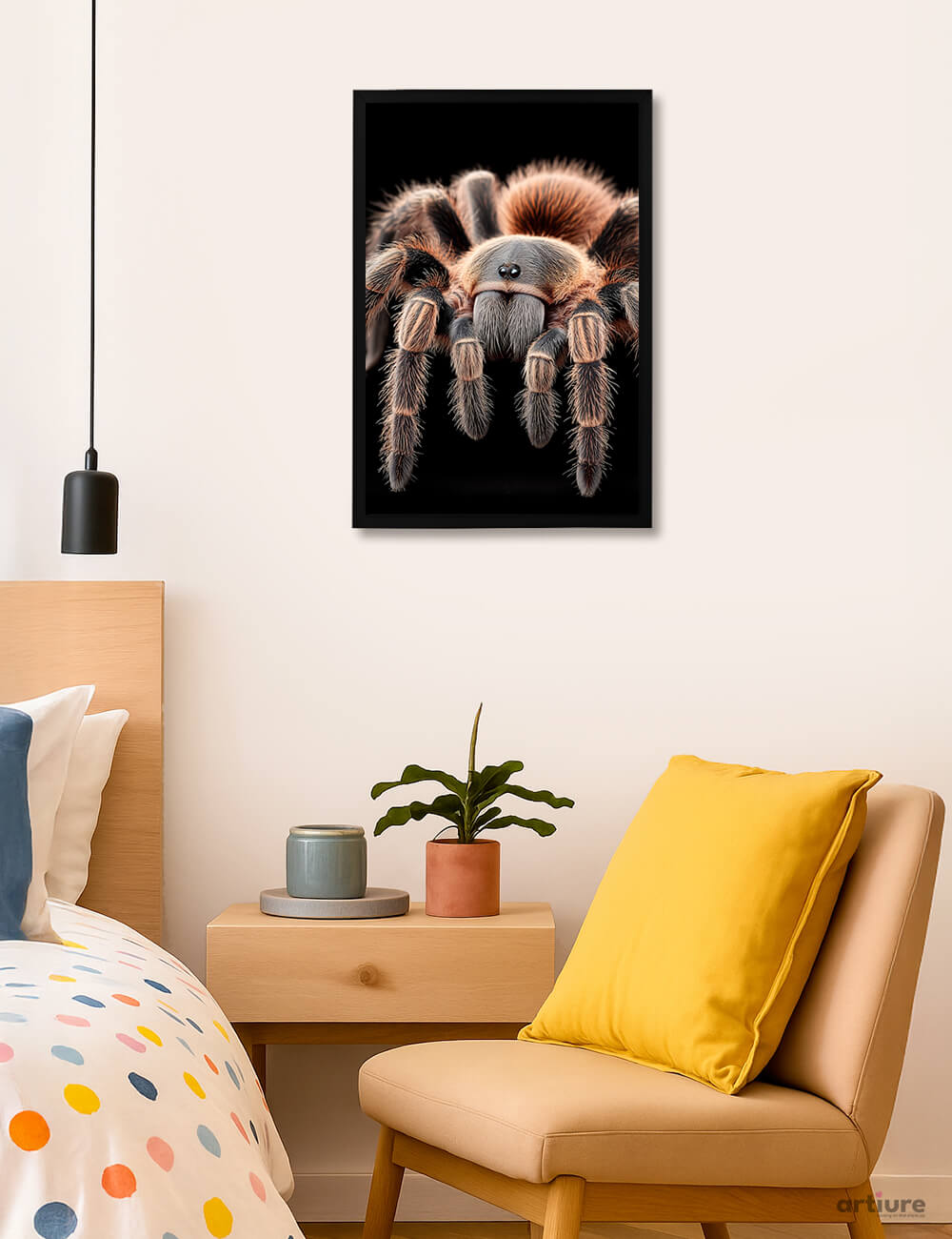 This portrait captures the tarantula in a moment of composed stillness, transforming a misunderstood creature into a study of form and texture. Fine hairs, layered legs, and subtle tonal shifts are rendered with extraordinary clarity, creating a sense of depth and tactile realism. The centered composition and dark background lend a sculptural, almost regal quality, inviting slow observation rather than fear. This artwork explores contrasts—delicacy and power, stillness and readiness—while celebrating nature’s precise design. Ideal for modern interiors, galleries, and collectors who appreciate bold natural subjects, this print commands attention with quiet authority and refined visual balance.