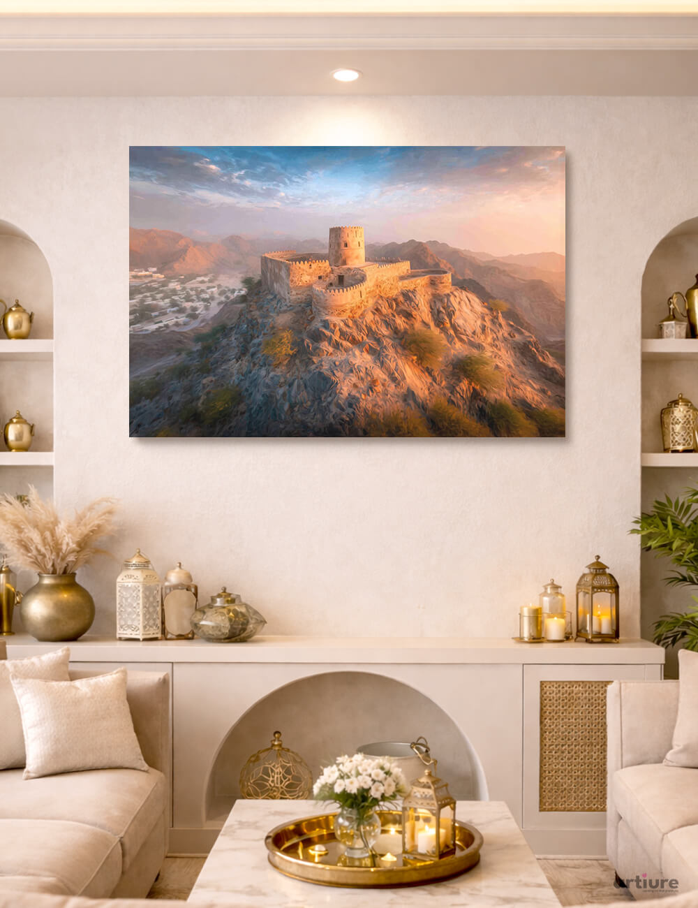 This canvas print captures a solitary fortress perched atop jagged desert rocks, drenched in the amber glow of a desert sunset. The warm palette of beiges, browns and gold echoes across the stone, while a blue sky softens the horizon. Textural details of the rugged terrain contrast with the fortress’s smooth masonry, inviting a quiet moment of reflection in a living space. The image leans into photographic realism, presenting a timeless landscape that pairs well with muted interiors and contemporary furnishings. Ideal for creating a focal point that balances light and serenity in a lounge, study, or gallery wall. Pair with warm metallic accents to enhance the sunset’s glow.