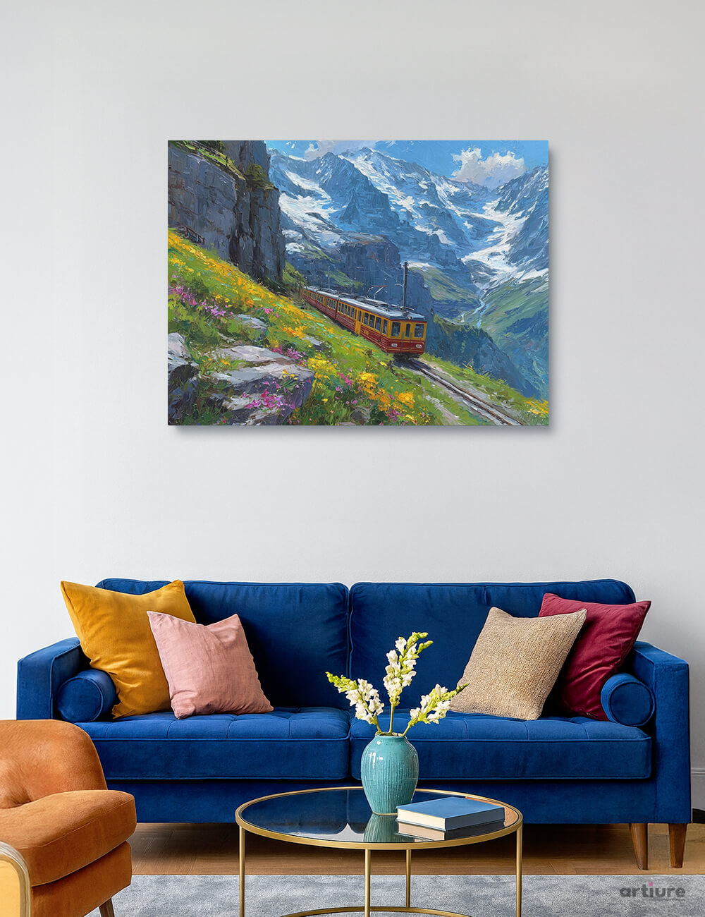"Alpine Passage" Canvas Print depicts a striking alpine journey, where a red-and-yellow train hugs the steep, winding tracks against a backdrop of sheer cliffs and glacier-capped mountains. The slopes burst with yellow, pink, and green tones from summer wildflowers, contrasting with the crisp blues and whites of the high peaks. The artwork’s textured brushstrokes and vivid palette evoke the charm of slow travel and the awe of nature’s grandeur.