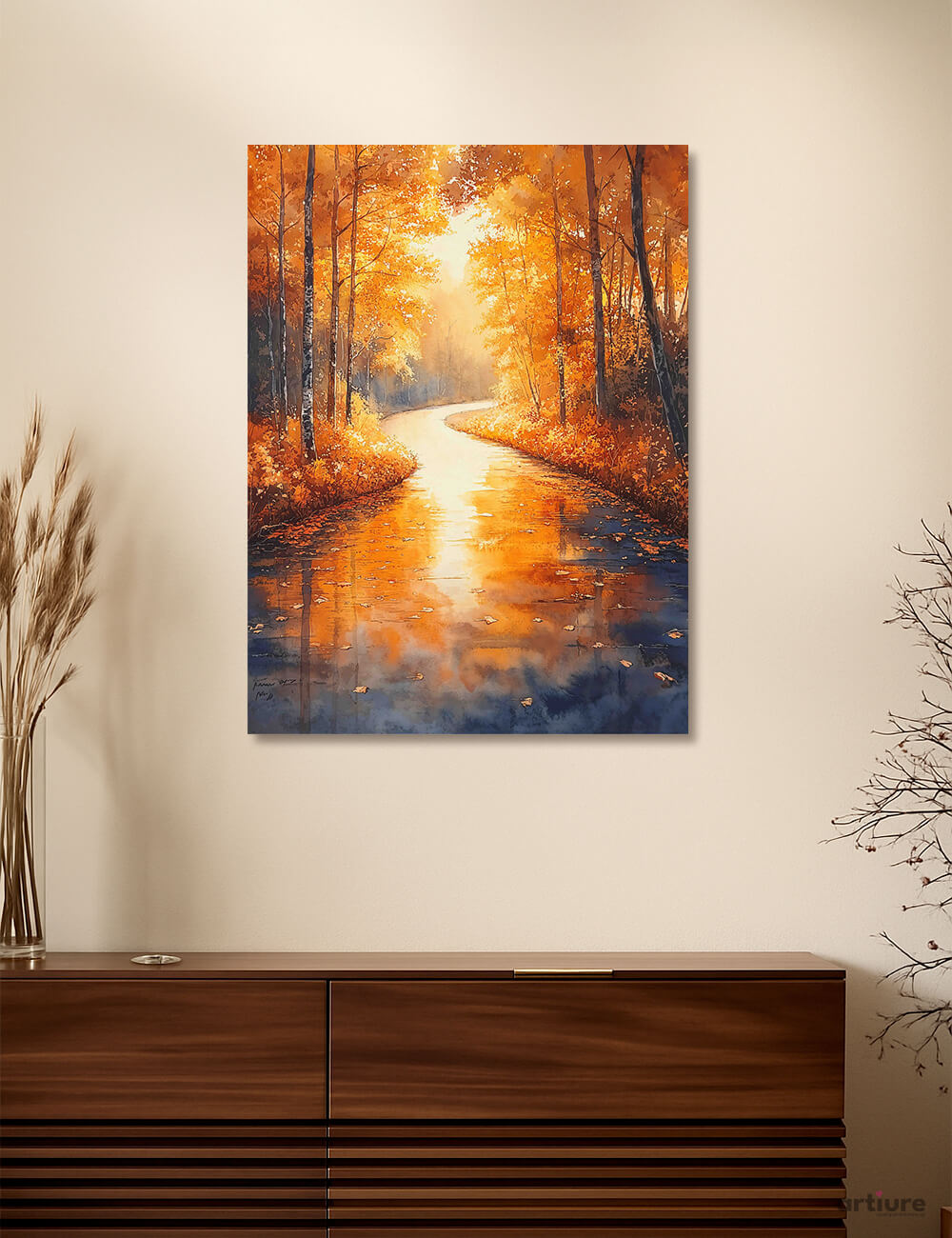This canvas print captures a sunlit autumn forest where a winding path follows a tranquil river. Tall trees blaze with orange and gold, their reflections spilling across the water in shimmering swirls. Illuminated through a soft haze, the scene balances vivid warmth with cool shadows, inviting a contemplative mood. The painterly brushwork leans toward impressionism, with visible strokes that suggest movement and season-change rather than photographic detail. The 4:3 canvas is versatile for living rooms, hallways, or workspaces seeking a serene, nature-inspired focal point. Pair it with neutral beiges, warm browns, and deep blues to echo the landscape’s palette. A touch of gold enhances the glow, making the piece glow at different times of day.