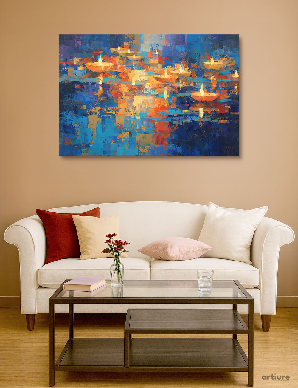 An expansive abstract canvas that captures motion and mood through a mosaic of color blocks. Bold blues and deep navy anchor the composition, while warm ambers and flashes of orange sketch the silhouettes of boats gliding across imagined water. The painting relies on rich texture and layered geometry to suggest light breaking on rippling surface, inviting slow, contemplative viewing. Placed above a neutral living room setting, the piece adds kinetic energy without overpowering the room, complementing soft furnishings and wooden accents. The artistic gesture is contemporary yet timeless, balancing cool restraint with luminous intervals of warmth. Perfect for modern living spaces craving a vivid focal point and a dash of cinematic color.