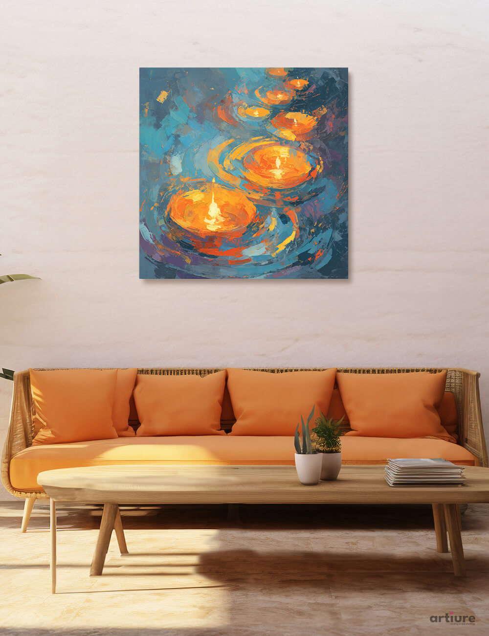 This canvas print captures a dynamic rhythm of luminous orbs in fiery orange, surrounded by a cool, swirling blue landscape. Thick, impasto-like strokes create tactile energy, suggesting movement as if ripples radiate across a moonlit pool. The piece balances warmth with cool intensity, making it a versatile focal point for modern living rooms, bedrooms, or office spaces. Its abstract composition invites personal interpretation while delivering a bold splash of color and texture. Printed on high-quality canvas for a premium gallery feel, it pairs well with both minimalist and eclectic interiors, adding depth and a contemporary glow to any wall.