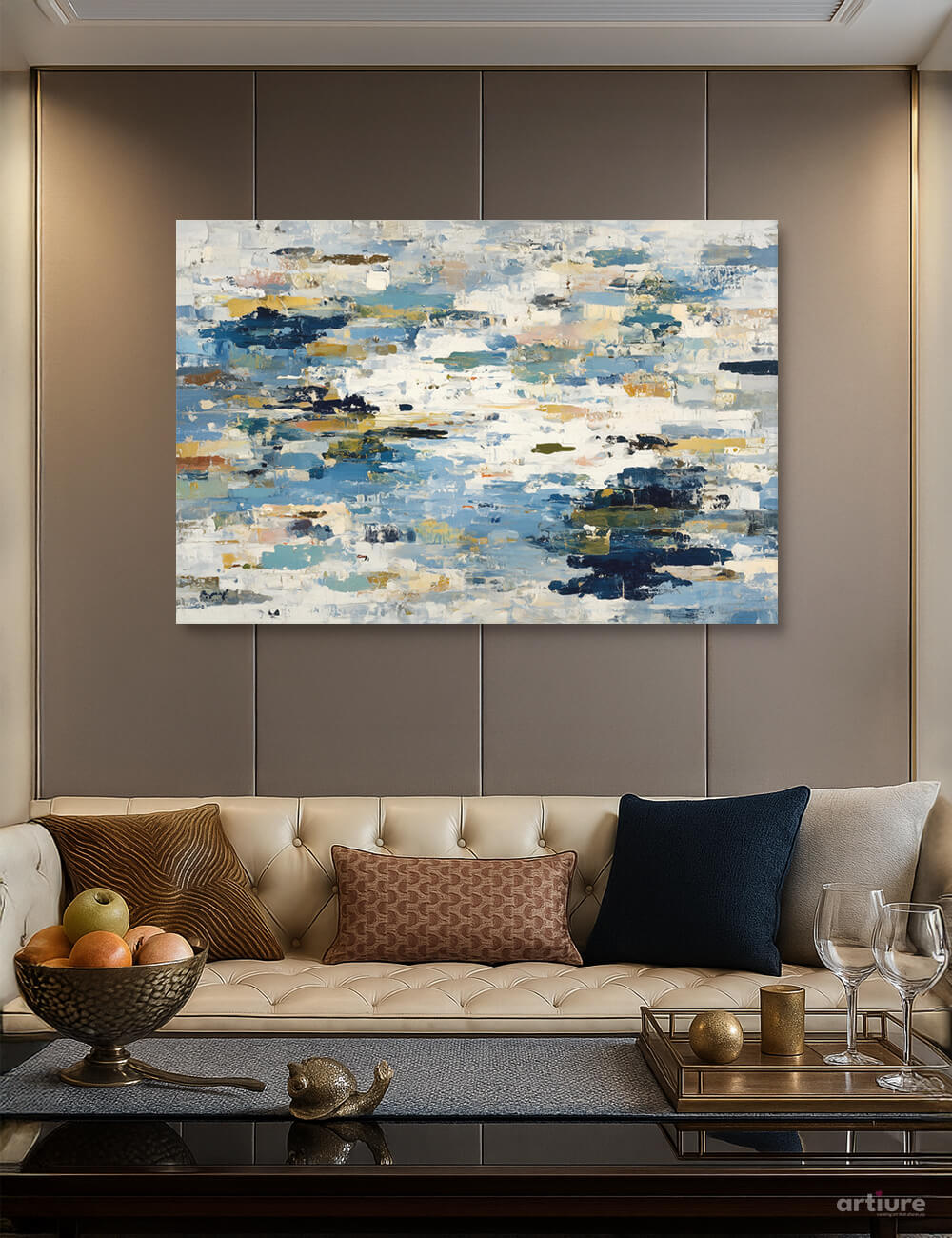 A breath of azure and ivory unfurls across a textured canvas, where bold brushstrokes collide into soft horizons. This abstract composition engages with sea-air tones—deep blues, pale ultramarines, and warm beige—creating a dynamic current of movement that remains serene. The layered palette and tactile impasto evoke coastal landscapes and nocturnal skies in a contemporary vocabulary, making it versatile for living rooms, study corners, or hotel lobbies. Printed on high-quality canvas, the piece preserves the painterly energy and subtle sheen of the original, inviting quiet reflection or bold focal presence. Perfect for modern interiors seeking a calm yet expressive statement that pairs with neutrals and metallic accents.