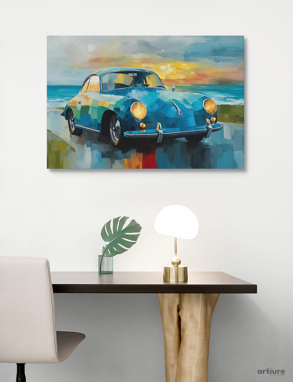 A dynamic canvas print capturing a classic blue car gliding along a sunlit coast. The image merges impressionistic brushwork with geometric color fields, creating a lively fusion of nostalgia and modernity. The palette leans toward cobalt blues, turquoise greens, and warm yellows, with soft, reflective surfaces suggesting wet pavement and a shimmering horizon. This piece evokes seaside road trips, summer evenings, and the glow of sunset over water. Its bold, blocky abstractions offer a contemporary focal point for living rooms, offices, or galleries, pairing well with minimalist furnishings or eclectic decor. Printed on high-quality canvas, the artwork delivers vivid contrasts and a tactile texture that enhances the motion and energy of the scene.