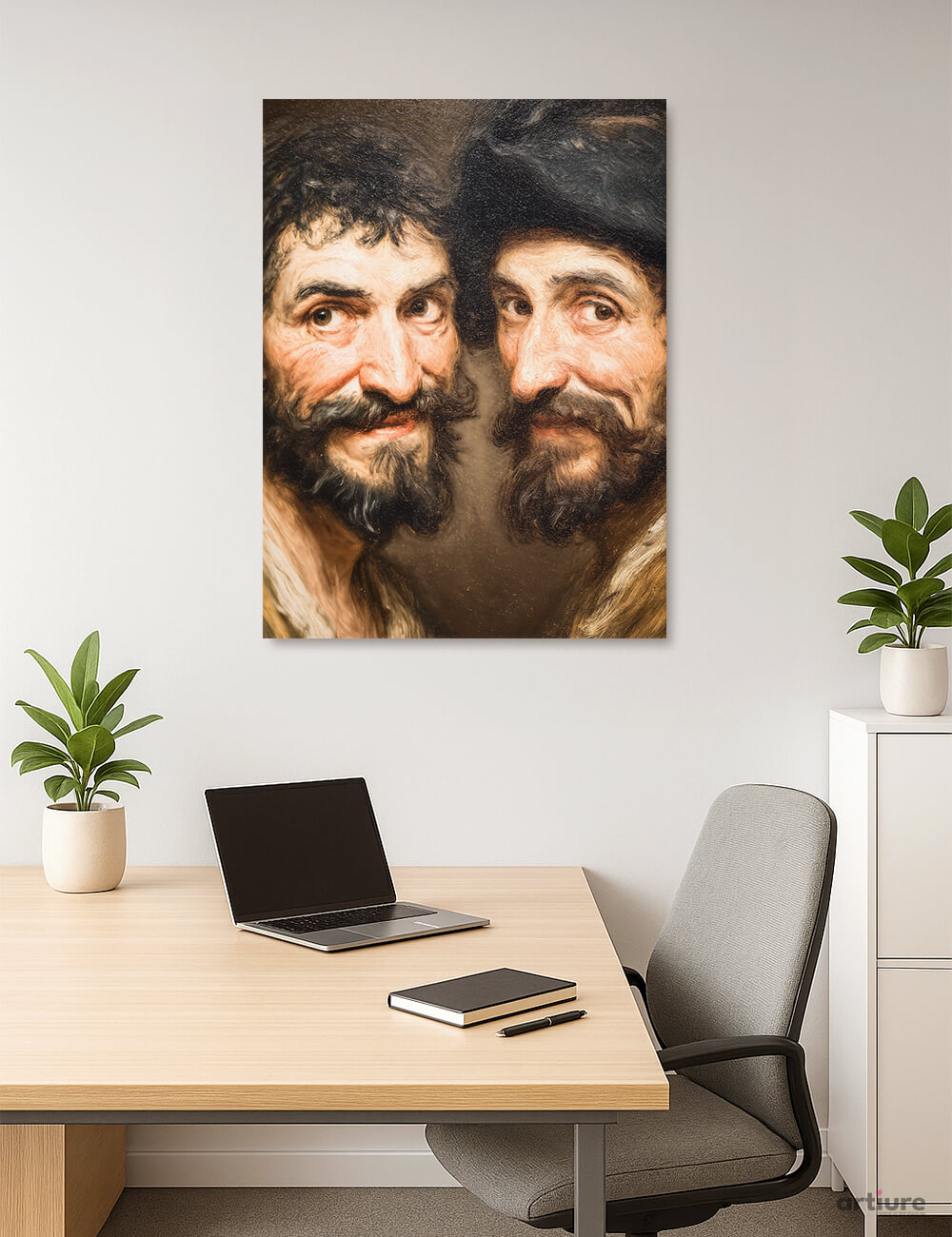 An evocative canvas print capturing two bearded figures in close dialogue, rendered with warm ochre, brown and ivory tones. This traditional portrait evokes classical studio painting, while its modern canvas print delivers crisp detail and tactile brushwork. The faces gaze toward the viewer with subtle, knowing smiles, inviting reflection and conversation. Rich, layered textures simulate oil on canvas, with luminous highlights that soften into muted shadows. Perfect for home libraries, study rooms, or office walls, it adds timeless character and refined warmth to neutral palettes and warm woods. AI-generated adjusts colors were tuned for print, preserving the mood of a historic portrait in a contemporary, wall-ready format.