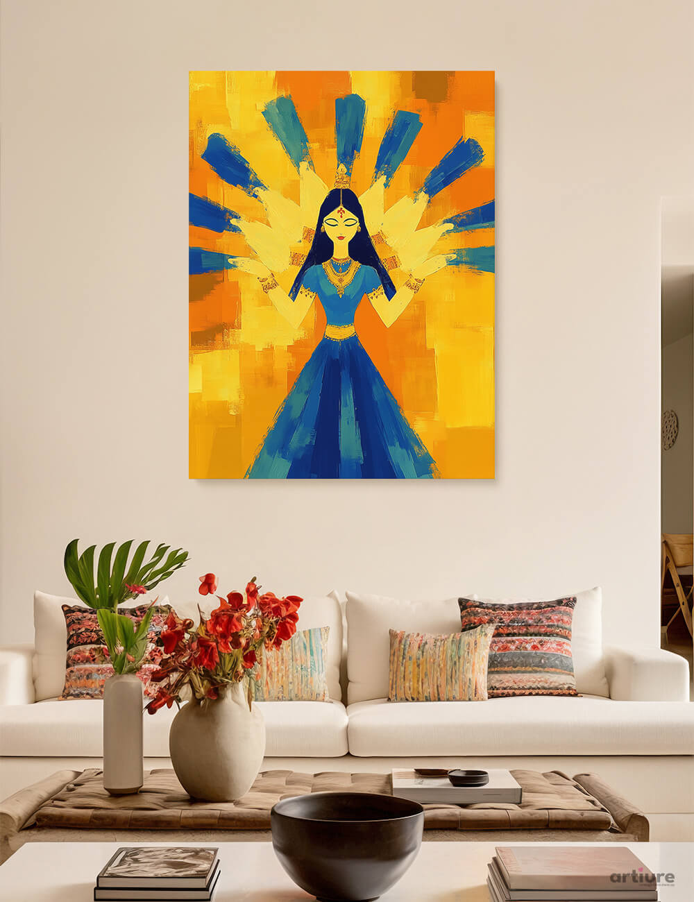 Blazing Durga captures the revered deity in a dynamic pose, multiple arms fanned out against a bold saffron and gold background. The impressionistic brushstrokes and striking color contrast highlight Durga’s role as a protector and embodiment of feminine power. Ideal for both devotional and artistic settings, this piece radiates spiritual energy and vibrant cultural flair.
