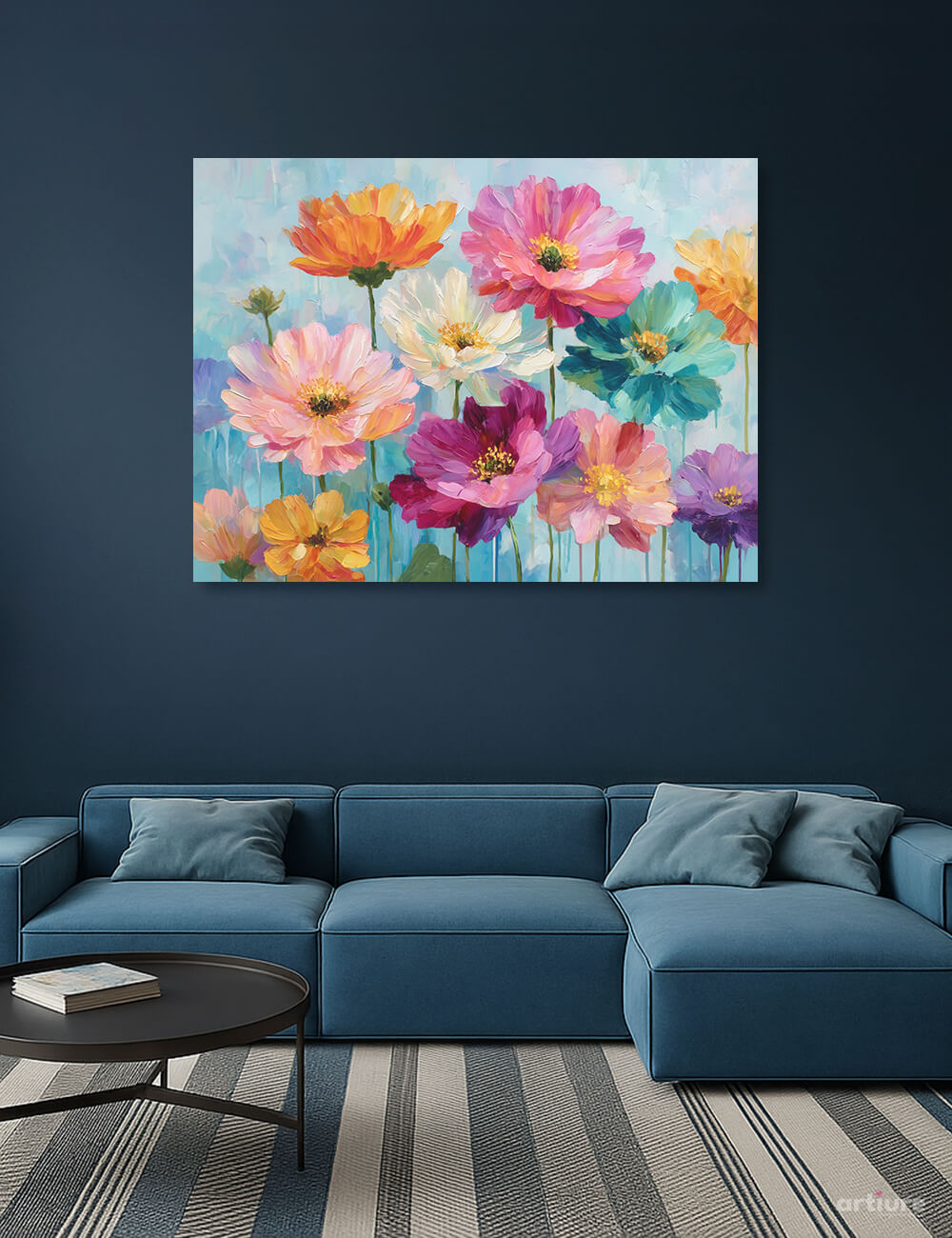 This canvas print captures a field of oversized blossoms rendered in bold, tactile strokes. The composition leans into impressionistic brushwork and contemporary color play, turning a bouquet into a celebration of hue. We see pinks, purples, teals, yellows and oranges popping against a cool blue background, with each petal built in thick layers that invite a closer look. The piece radiates playful energy, making it a focal point in modern living spaces or creative studios. Its bright palette pairs especially well with navy walls and neutral furnishings, offering a lively contrast without overwhelming the room. Printed on canvas for a museum-like presence, it invites lounging, conversation, and daily inspiration.