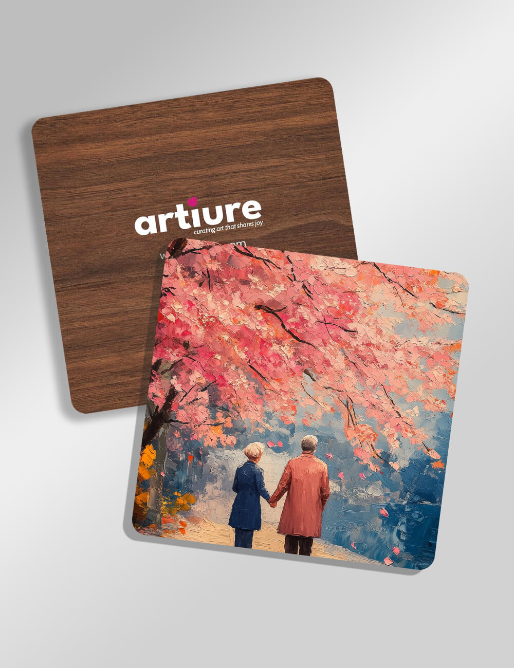 These coasters marry artful warmth with everyday utility. A softly textured impressionist scene unfolds: a couple walking beneath blooming cherry branches, painted in blush pinks and coral, set against a cool blue backdrop. The wood-backed surfaces echo natural grain for a tactile, cafe‑corner charm. Each piece guards tabletops with cork-like resilience while delivering a gallery-worthy moment to the dining table or kitchen counter. Designed for modern homes that value mood and memory, they pair well with neutral palettes or as a gentle pop of color in dining spaces. Handled as a set, they invite evening tea, conversations, and moments of quiet joy.