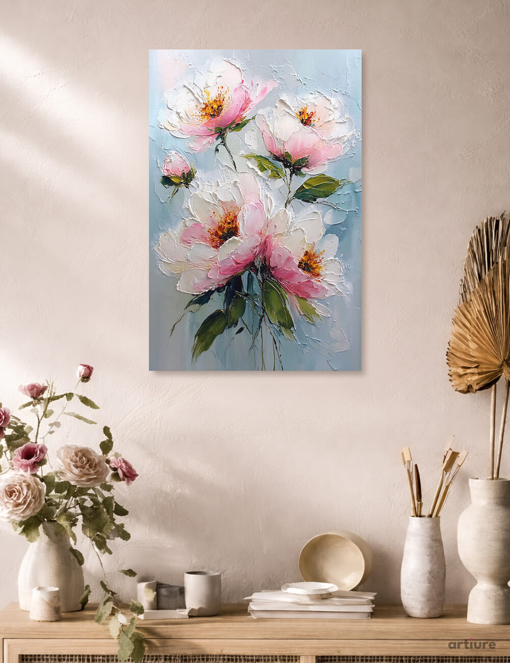 A vivid floral composition rendered in thick impasto on a cool blue field. The bouquet features pink and white petals with bright amber centers, supported by lush green leaves. The heavy texture gives sculptural depth, catching light and inviting close inspection. The composition feels airy and luminous, balancing softness with tactile drama to evoke a serene, uplifting mood ideal for living rooms or bedrooms.
