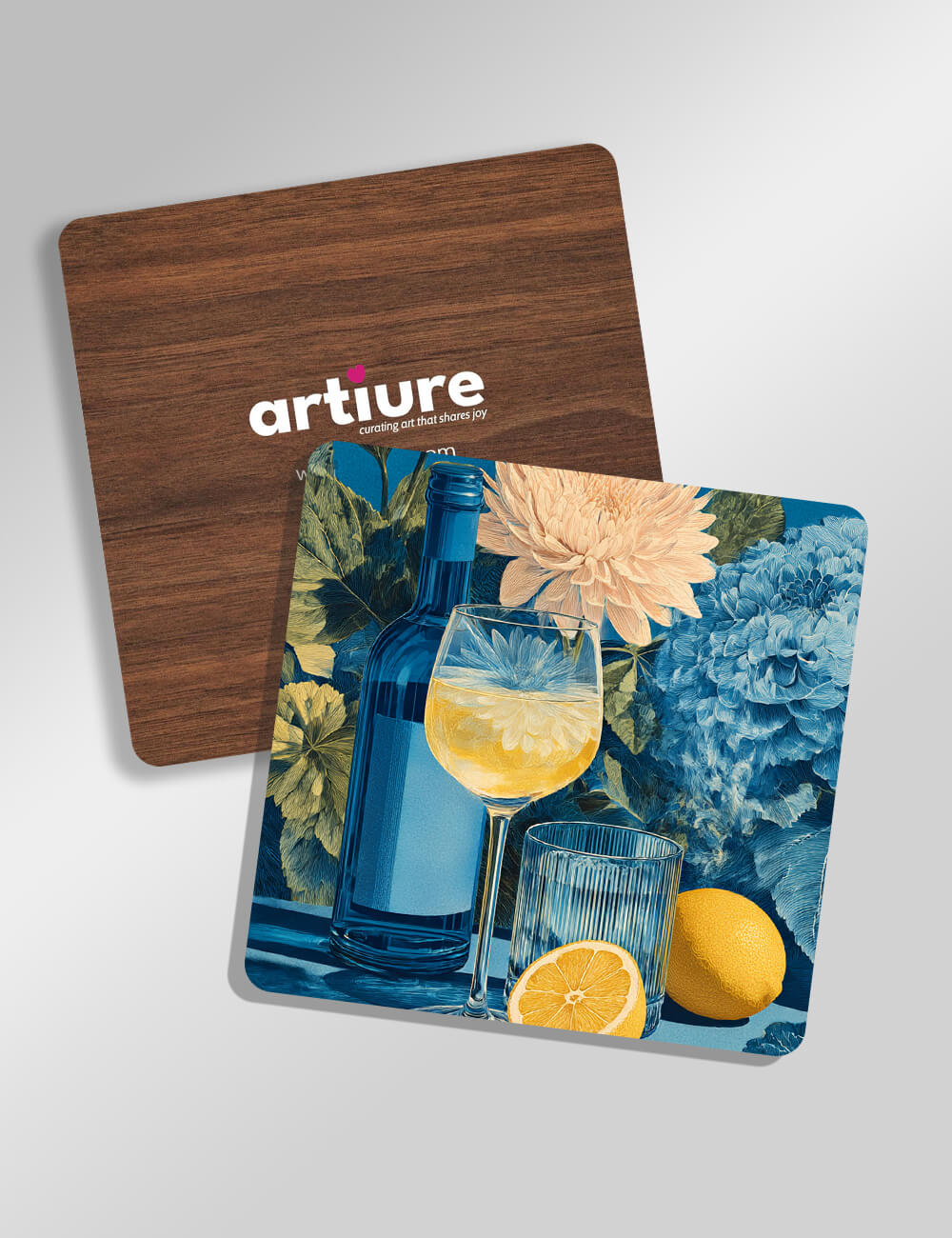 Vibrant floral coasters layer with a deep blue bottle and citrus imagery to create a dynamic tablescape. The rounded corners and glossy finish contrast warm wood tones with bold blues and sunny yellows, delivering a modern still-life vibe for kitchen and dining spaces. The botanical backdrop feels lush and contemporary, while the white branding on the front adds a crisp, artisanal touch. Designed for everyday use, these coasters protect surfaces while adding visual interest to casual meals and entertaining moments. Ideal for contemporary homes seeking a pop of color and botanical charm, they double as thoughtful gifts for hosts, new homeowners, or design lovers who appreciate playful yet refined decor.