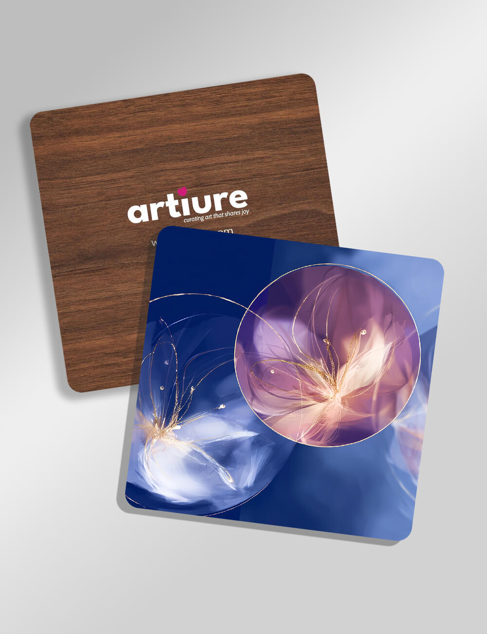 Two coaster designs merge digital abstraction with botanical light. A deep blue field hosts translucent orbs in violet and pink, concentric rings tracing their delicate contours, while fine gold lines weave a web of motion across the surface. The back reveals a warm wooden substrate that grounds the ethereal spectacle, making these pieces feel at home in modern dining spaces or cozy café corners. Printed on durable, moisture‑resistant material, the artwork is crisp and vivid, designed to elevate tabletops without overpowering the setting. This piece invites quiet contemplation during coffee breaks or dinner prep, pairing well with minimalist tableware or bold furniture accents. A tasteful gift for art lovers who favor calm, luminous graphics in everyday rituals.