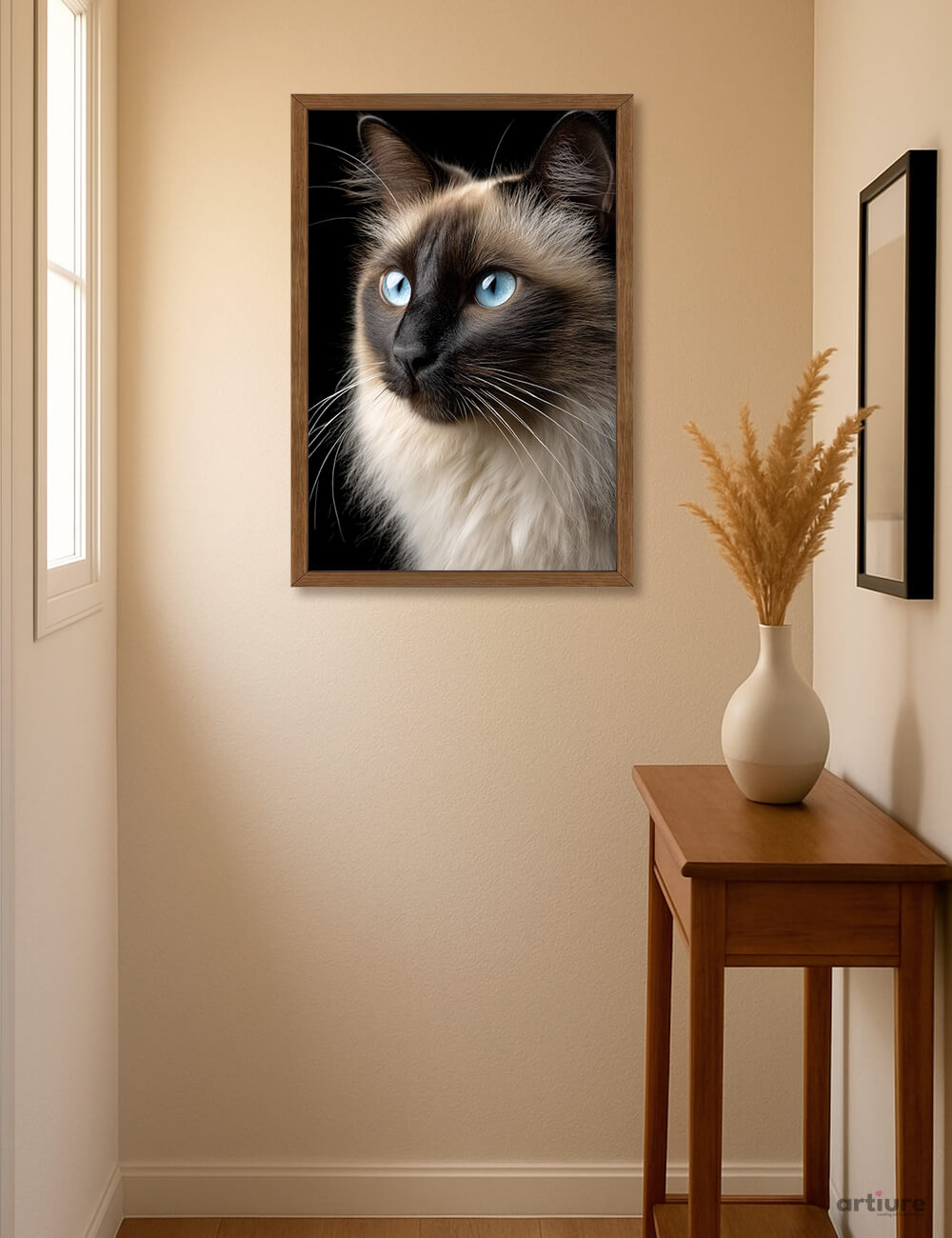 A photographic feline portrait featuring a Siamese cat with striking blue eyes, set against a deep black backdrop within a warm wooden frame. The piece anchors a sunlit hallway, where beige walls, a slender console table, and dried grasses create a serene, minimalist backdrop that emphasizes the subject’s calm vigilance. The composition invites a quiet pause, allowing the cat’s attentive gaze to become a focal point within a domestic moment. The restrained palette and clean lines make it a versatile accent for contemporary spaces seeking understated luxury. Printed on high-quality stock, this art print brings a timeless, intimate mood to living rooms, entryways, or stairwells.