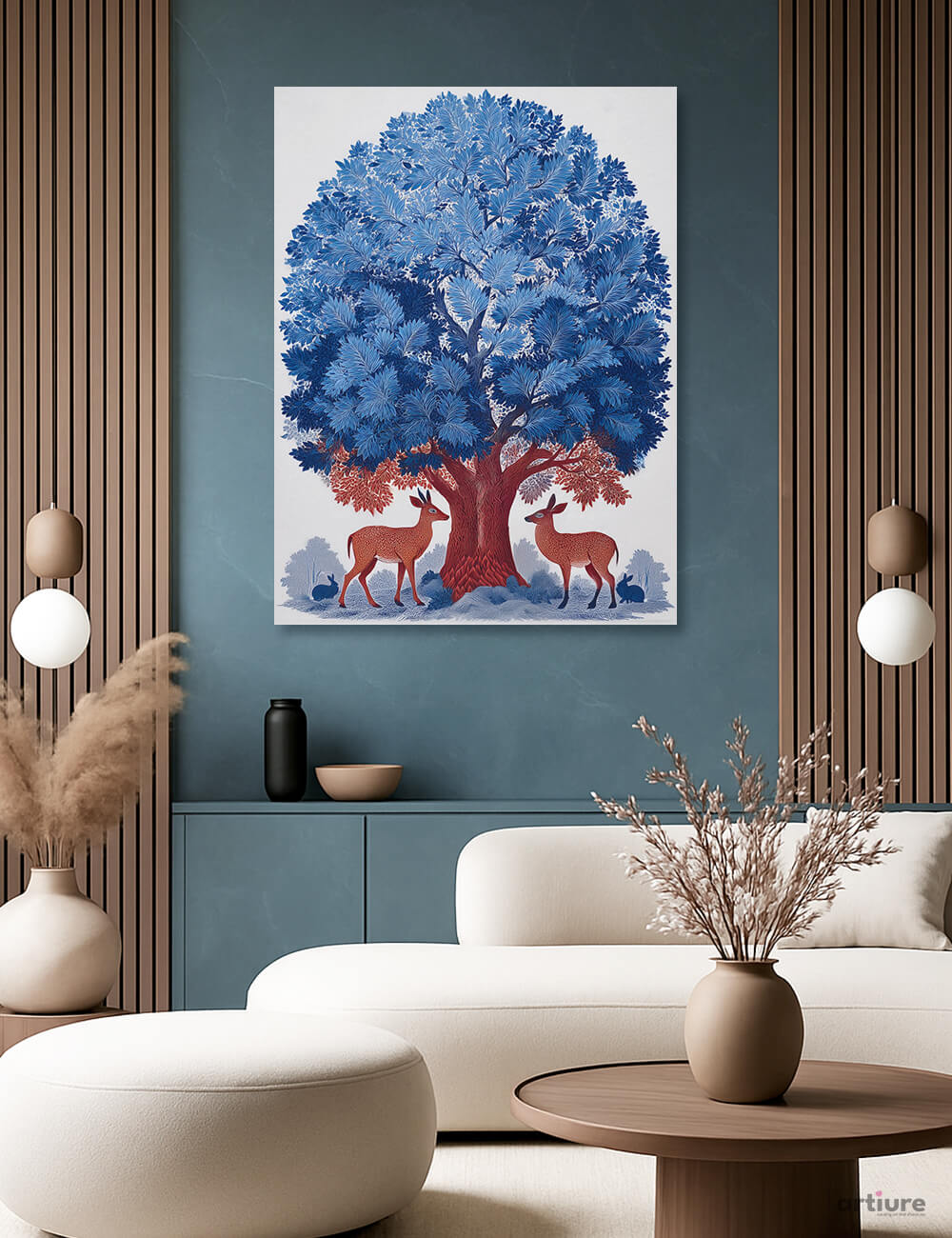 An arresting canvas print that anchors a contemporary living space with a dreamlike landscape. A grand tree, its foliage rendered in luminous blues, rises from a crimson trunk, its branches spilling into a pale, misty ground where deer pause as quiet witnesses. The composition fuses surreal whimsy with painterly precision, balancing cool cobalt tones with pockets of warm red to guide the eye. Against a crisp white backdrop, the artwork appears to glow, inviting reflection and conversation. Perfect for modern interiors seeking a bold, nature-inspired focal point, this print pairs well with matte ceramics, timber accents, and muted walls, elevating calm textures into a refined, imaginative gallery statement.