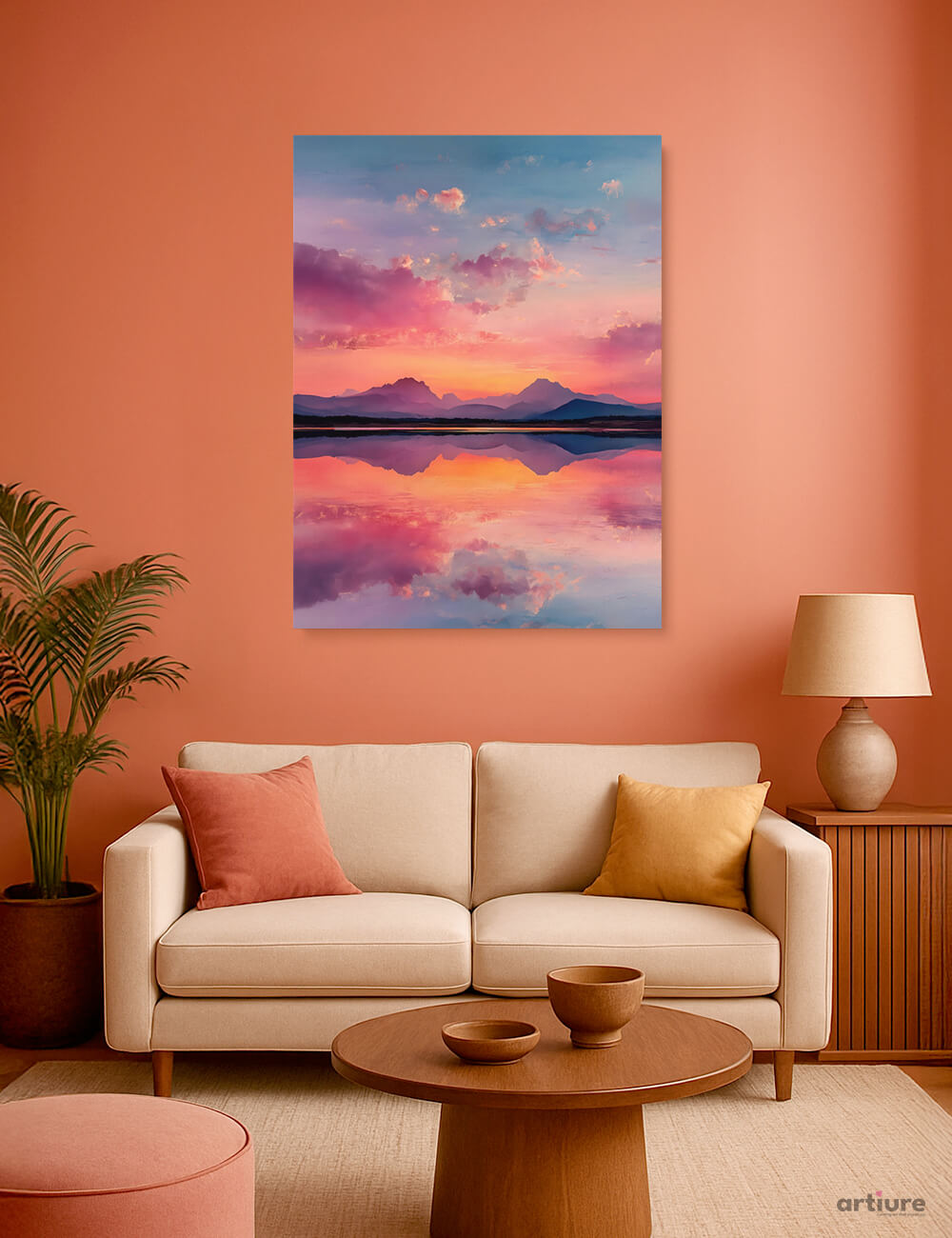 A breathtaking sunset landscape captured on canvas print, revealing a tranquil lake that perfectly mirrors the fiery sky. Soft pinks melt into lavender and deep blues, with distant mountains forming a quiet silhouette. The composition invites calm contemplation while infusing the room with warm, cinematic light. Designed for contemporary interiors, this piece pairs well with warm neutrals and organic textures, enhancing cozy living spaces without overwhelming them. Its AI-generated palette embraces dreamy gradients, offering a modern focal point that feels both ethereal and grounded.