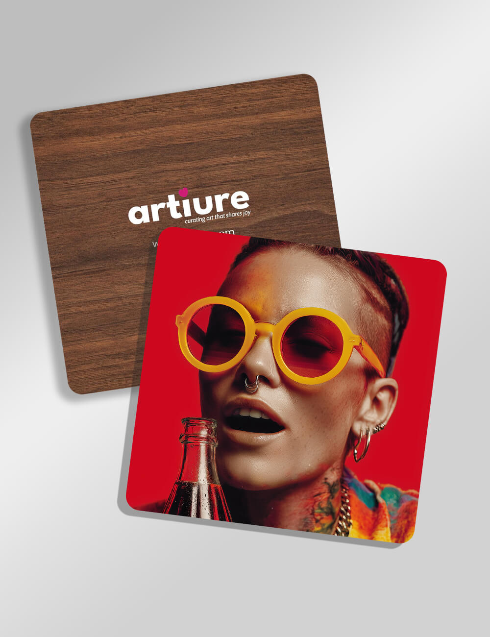 A striking photographic coaster design that pairs fashion-forward edge with a playful color punch. The image features a bold portrait set against a saturated red backdrop, accented by bright yellow sunglasses and vivid details in the subject’s earrings and attire. A wood-grain back provides a natural, tactile contrast to the glossy print, making this coaster as much a piece of art as a functional accessory. Ideal for lively kitchens, dining nooks, or coffee corners, it brings contemporary flair to everyday moments while protecting surfaces. The composition channels pop-art energy with modern photography, turning a simple coasters into a statement piece that sparks conversation and color in any space.