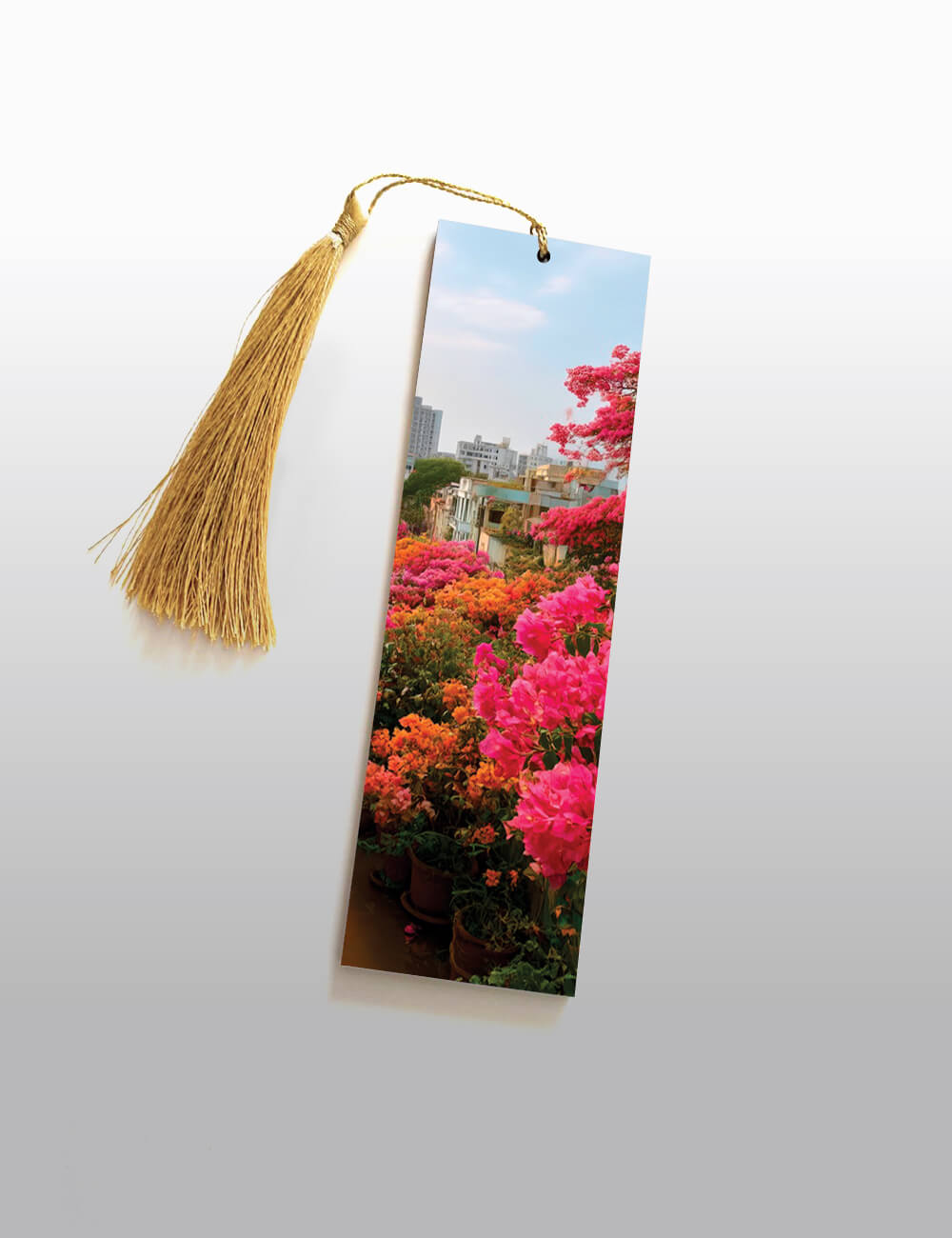 "Bougainvillea Dreams" Wooden Bookmark (2 x 6 inch) is crafted from 2.7 MM Pine Wood and UV Printed on both sides. This piece brings the joy of springtime into your hands, showcasing a radiant city terrace garden overflowing with pink and orange bougainvillea blooms against an urban skyline. Finished with a golden tassel and matte surface, it’s a celebration of color, nature, and quiet moments—perfect for nature lovers and city dreamers alike.