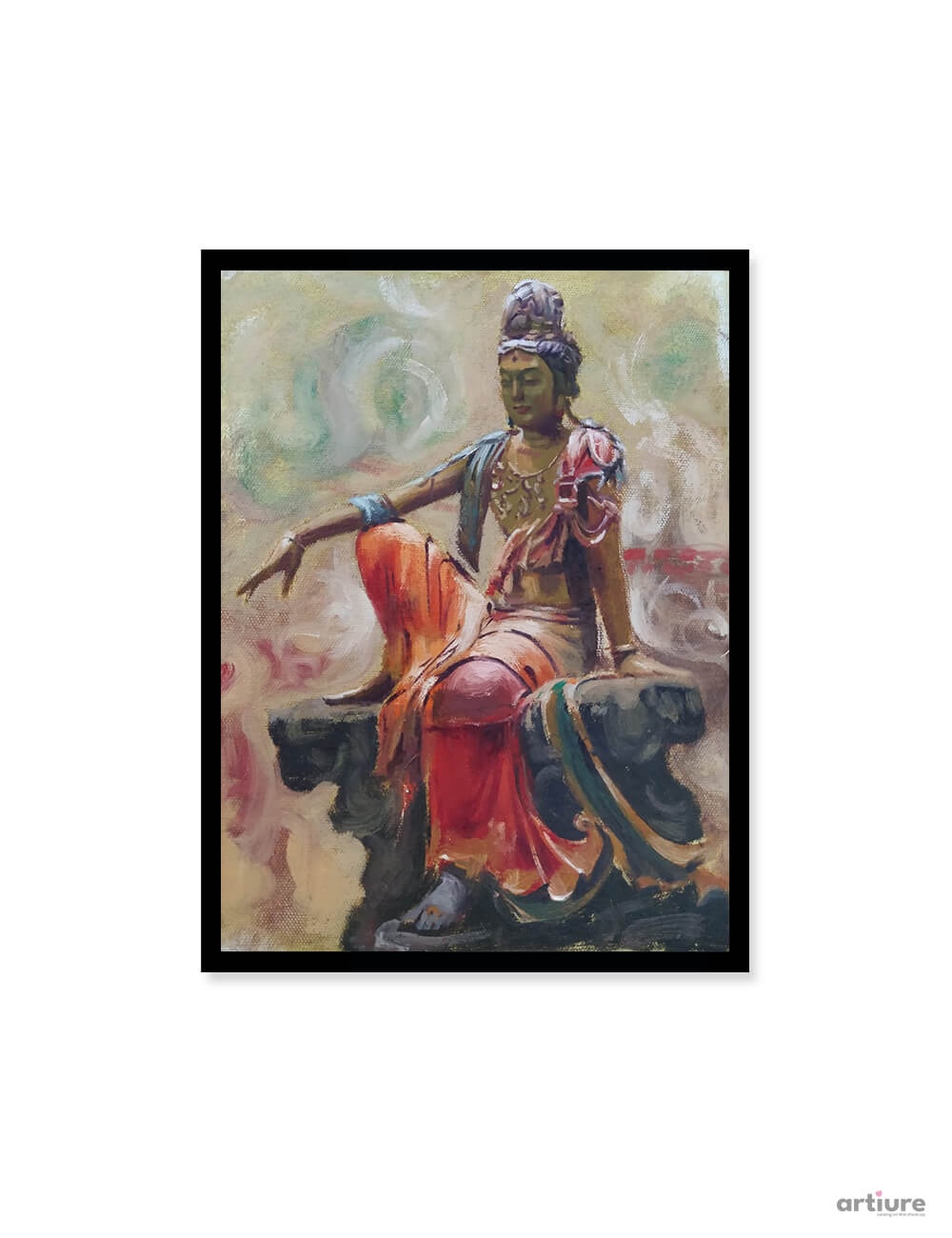 This expressive oil on canvas artwork portrays Buddha seated in serene contemplation, radiating calm, balance, and inner peace. Painted with rich earthy tones and warm highlights, the composition combines impressionistic brushwork with spiritual symbolism. The flowing robes in shades of saffron and crimson add movement and depth, while the softly abstract background enhances the meditative atmosphere. The square format creates visual harmony, making it ideal for modern homes, meditation rooms, yoga studios, or spiritual spaces. This painting brings a sense of tranquility, mindfulness, and timeless wisdom, transforming any interior into a peaceful sanctuary filled with positive energy.