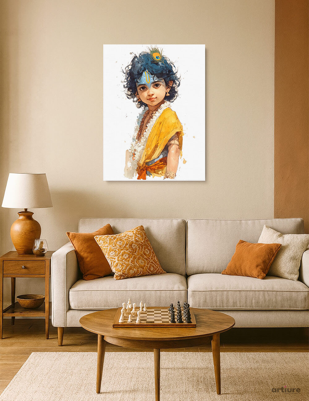 "Child of Grace - Krishna" Canvas Print captures the quiet charisma and innocence of young Krishna in a fluid watercolor style. Adorned with a peacock feather, rudraksha beads, and bright yellow draping, the divine child gazes softly forward his expression full of poise and peace. The minimal background draws attention to the figure’s elegance and makes it ideal for pooja rooms, nurseries, and contemplative spaces that seek both beauty and meaning.