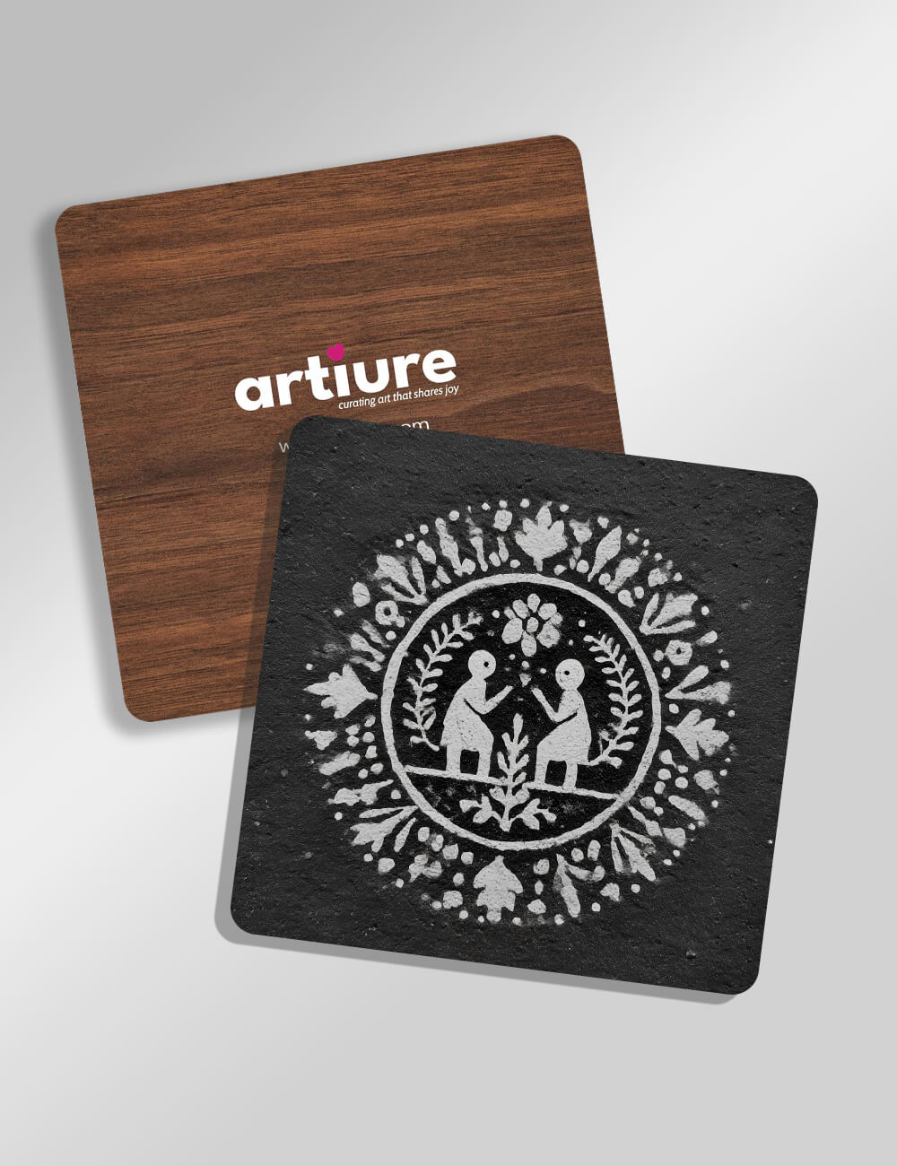 A duo of coasters crafted from slate and wood showcases a striking white circular motif inspired by folk-art. The central scene depicts two figures within a blooming floral ring, balanced by a textured stone surface for tactile appeal. The warm wood tone contrasts with the cool black slate, making these coasters versatile for both casual and refined kitchens or dining areas. Ideal as a gifting accent or a tasteful addition to a coffee table, they pair well with natural textures and neutral palettes.