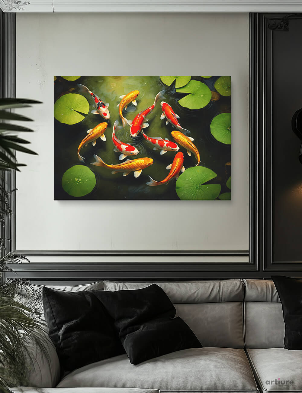 Circle of Prosperity presents a lively school of koi fish circling gracefully beneath verdant lily pads. The brilliant orange, red, and gold hues contrast against the pond’s calm depths, embodying serenity and positive energy. Ideal for living rooms, restaurants, or Feng Shui-inspired interiors seeking a dynamic yet peaceful focal point.