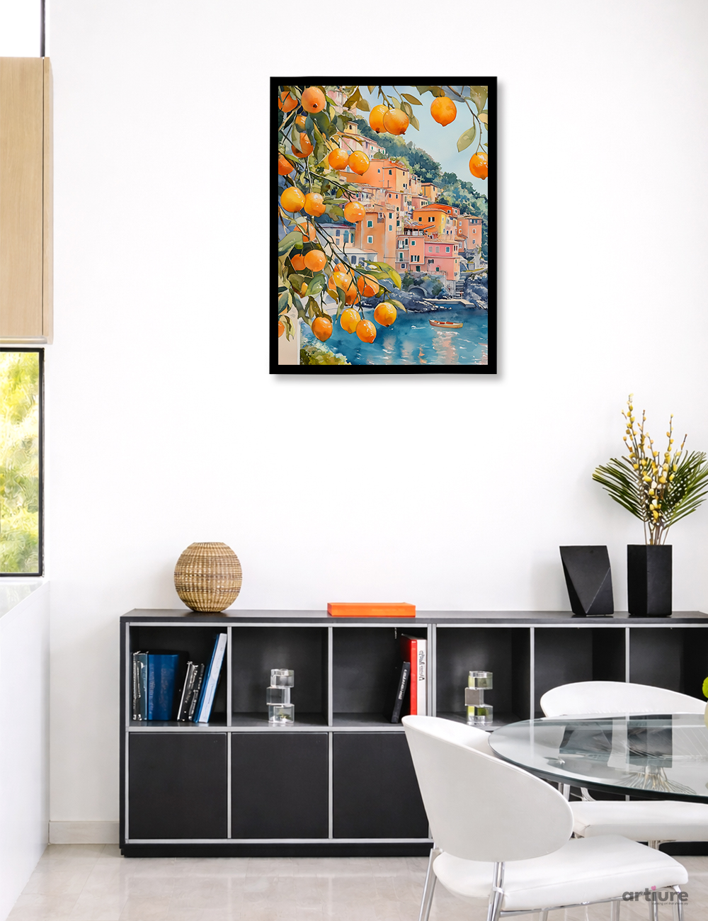 There's something about the way citrus hangs heavy in the foreground that makes you want to reach through the canvas and pluck one straight from the branch. This piece captures that perfect Mediterranean moment — when the light turns everything golden and the sea looks like it's been painted with the deepest blue you can imagine. Coral and terracotta houses cascade down the hillside like a watercolor dream, each one catching light differently. A small boat bobs in the harbor, patient as the afternoon stretches long. The orange trees create a natural frame, their fruit so ripe and real you can almost taste the sweetness. This belongs in a kitchen where meals linger, a dining room that hosts long conversations, or any space that needs a daily dose of sunshine and the promise of faraway places.