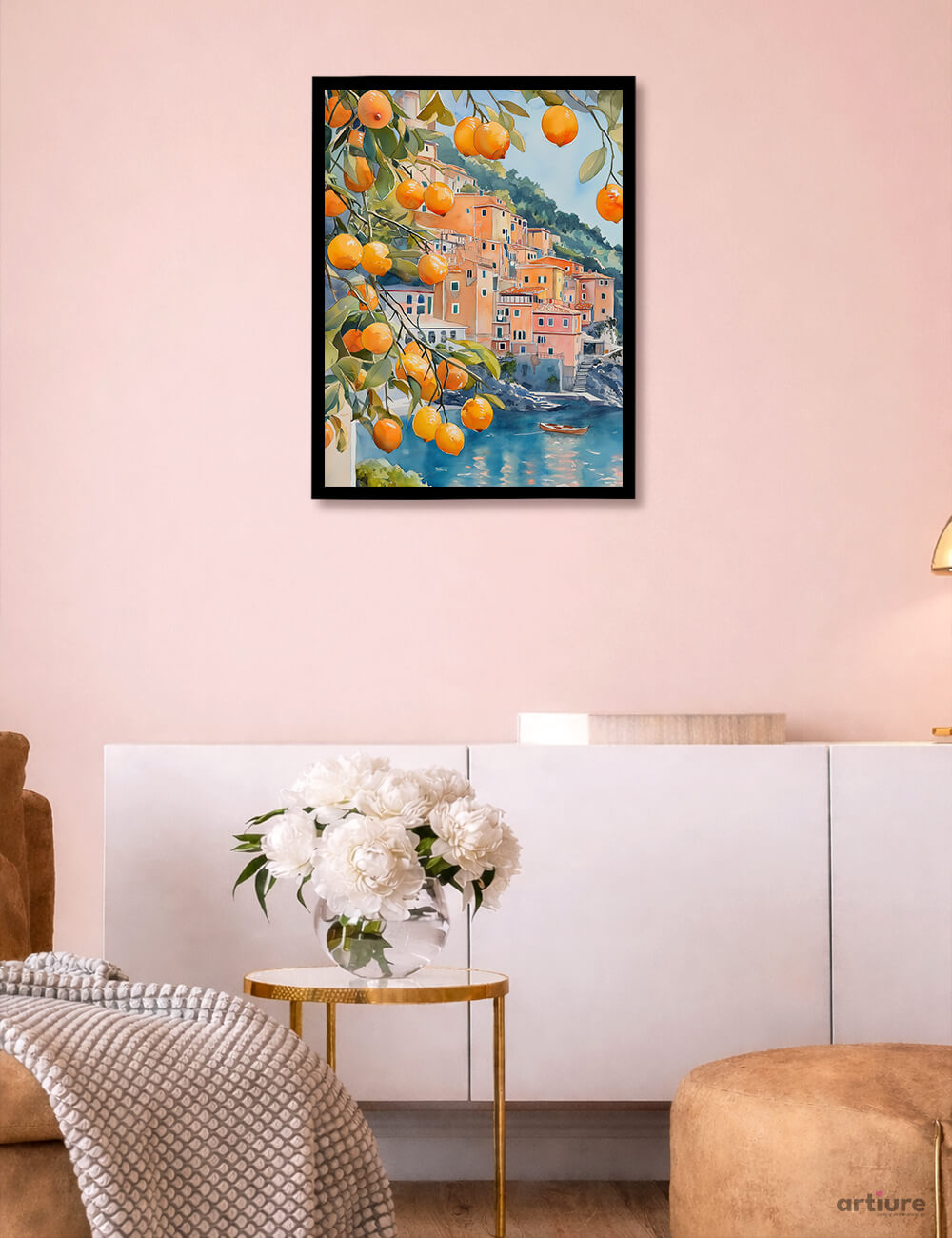 There's something about the way those oranges hang heavy in the foreground that makes you want to reach through the frame and pluck one. This is the Mediterranean at its most generous — where coral-pink houses tumble down hillsides toward waters so blue they seem to hold the entire sky. The citrus branches create a natural window, their bright fruit echoing the warm terracotta rooftops below. Every detail invites you deeper: the gentle lapping of water against weathered stone, the way afternoon light catches each orange like a small sun. It's the kind of view that makes you forget about deadlines and remember what it feels like to simply breathe. Perfect for a kitchen that needs a dose of warmth, a dining room ready for conversation, or any space where you want to feel like you're perpetually on the best vacation of your life.