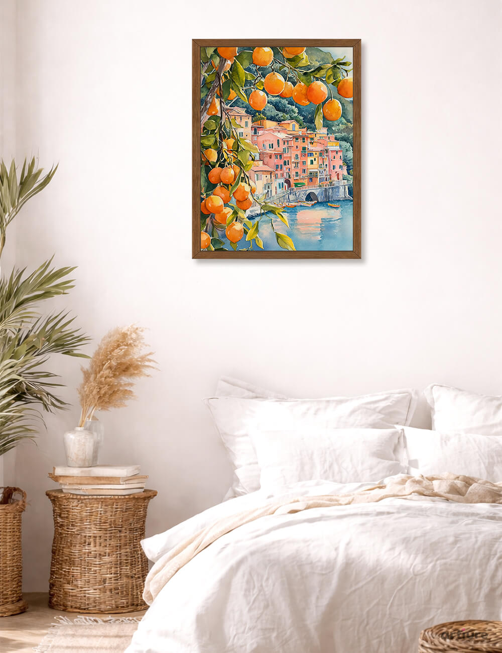 There's something about the way these oranges hang heavy on their branches — like they're guarding a secret view of paradise. Behind their golden curtain, a village tumbles down to meet the sea in shades of coral and terracotta, each house a different note in the same warm song. The water catches light like scattered coins, and you can almost taste the salt air mixed with citrus sweetness. This is the kind of view that makes you want to book the next flight out, or at least hang it where you'll see it first thing each morning. Perfect for a kitchen that needs more sunshine, a dining room ready for conversation, or any wall that could use a daily dose of wanderlust.