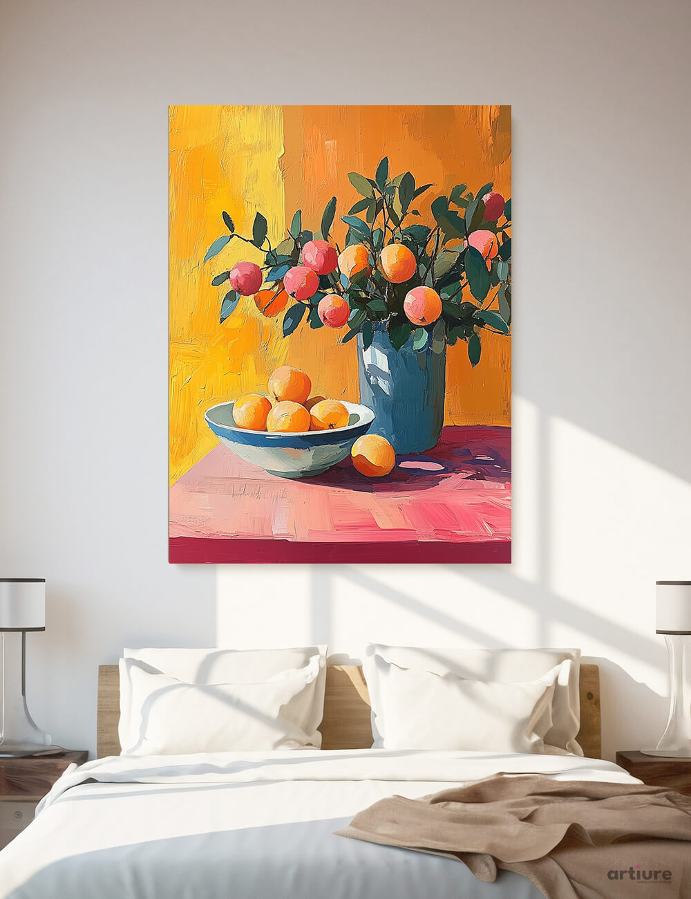 Citrus Still-Life is a modern portrayal of fresh oranges displayed in a bowl and vase. Painted in expressive brushstrokes and warm hues, it exudes a lively, sun-kissed charm that enlivens kitchens, dining areas, and cafés alike.