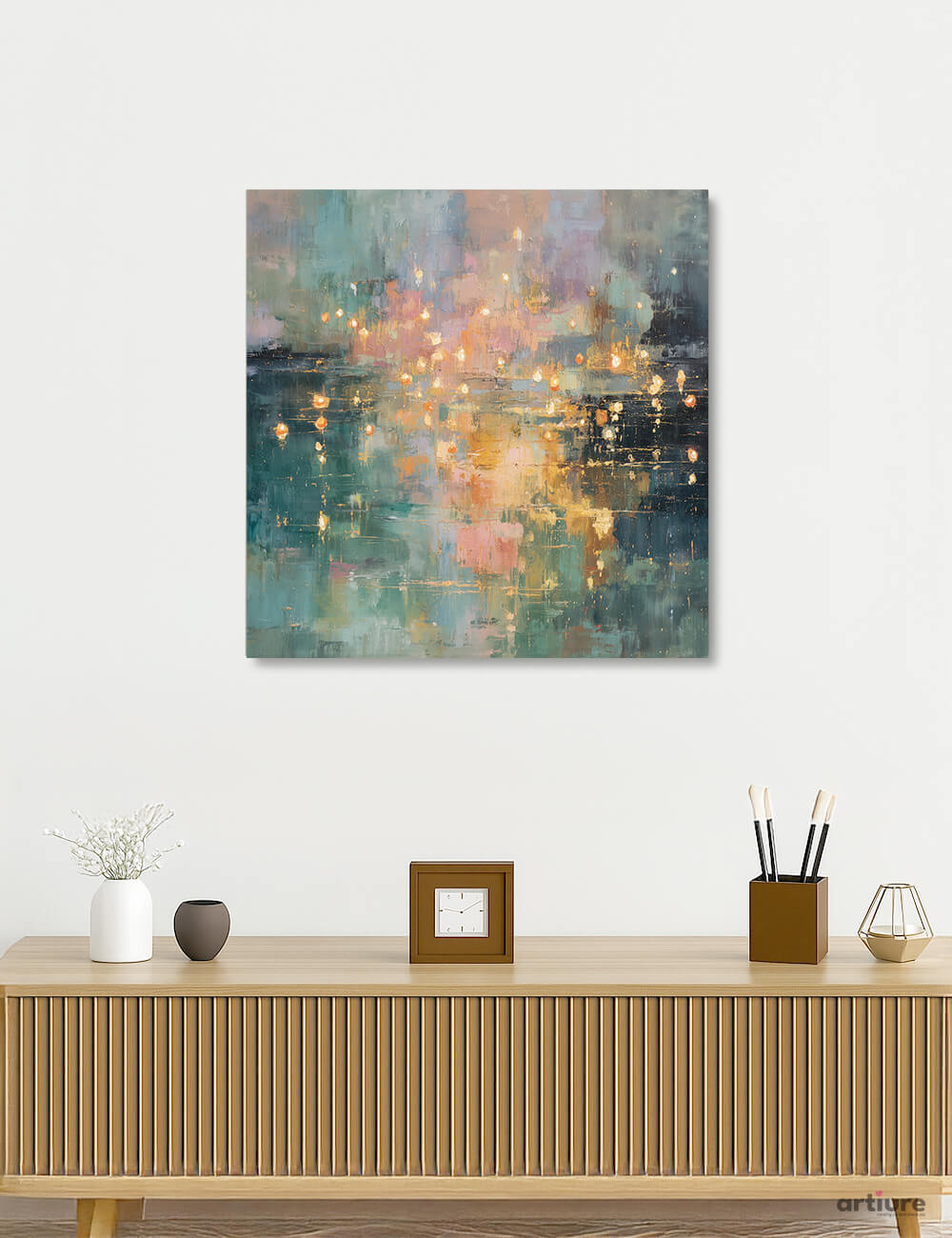 An exuberant abstract canvas that mimics city lights shimmering on a rain-washed surface. Layered brushstrokes blend teal, blue, green and pink tones with shimmering gold flecks, creating a sense of movement and luminous depth. The composition balances cool, moody hues with warm accents, making it a versatile focal point for contemporary living rooms, bedrooms, or workspaces. The painterly texture invites closer inspection, while the soft gradients allow the piece to glow against light walls or neutral palettes. Printed on canvas for a museum-like presence, this work pairs well with minimalist furnishings or bold mid-century pieces, adding an urban, cinematic mood that feels both sophisticated and inviting.
