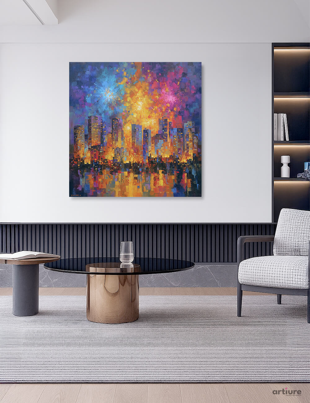 An electric cityscape unfurls across a square canvas, where bursts of color leap from the skyline and ripple into a mirrored river of light. Thick impasto textures blend royal blues, violets, sunlit yellows, and hot pinks, creating a kinetic skyline that feels both urban and dreamlike. This abstract composition captures the celebratory mood of a nocturnal panorama, balancing bold blocks with delicate glints of reflection. Perfect for contemporary living rooms or creative workspaces, the piece brings a sense of motion and warmth to minimal interiors, while its 1:1 format anchors a versatile focal point above a sofa or sideboard. Printed on high-quality canvas to preserve texture and vibrancy.