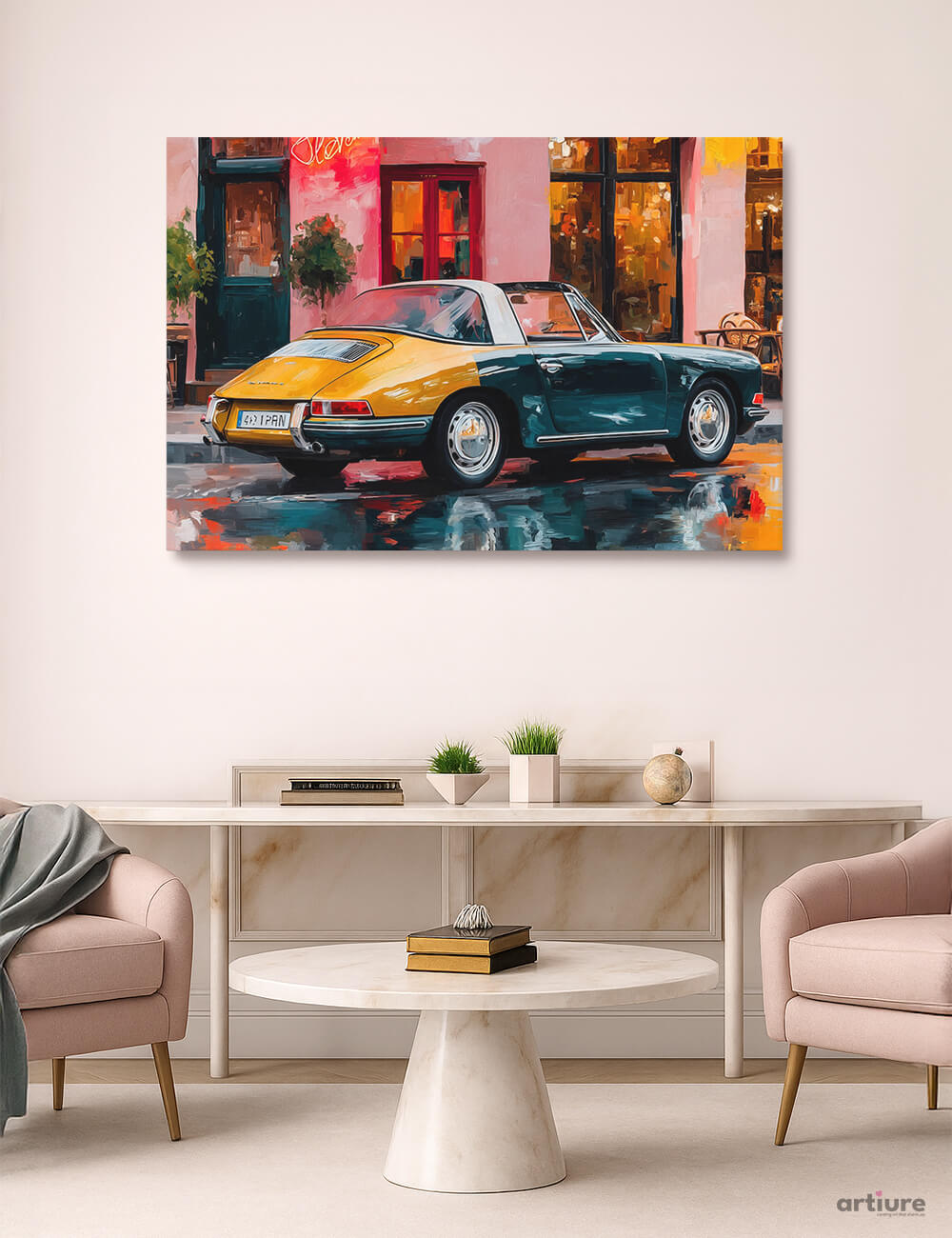 A lively canvas print of a glossy vintage car parked along a rain-slick city street. The car features a bold yellow hue with a teal body and white roof, set against pink storefronts and warm window glows. The impressionistic brushwork and rich reflections on the wet pavement create a dynamic, contemporary mood that feels both nostalgic and fresh. This piece blends retro charm with modern energy, making it an ideal focal point in living rooms or creative spaces. The palette balances bright accents with grounded tones, ensuring the artwork energizes the wall without overwhelming the room.