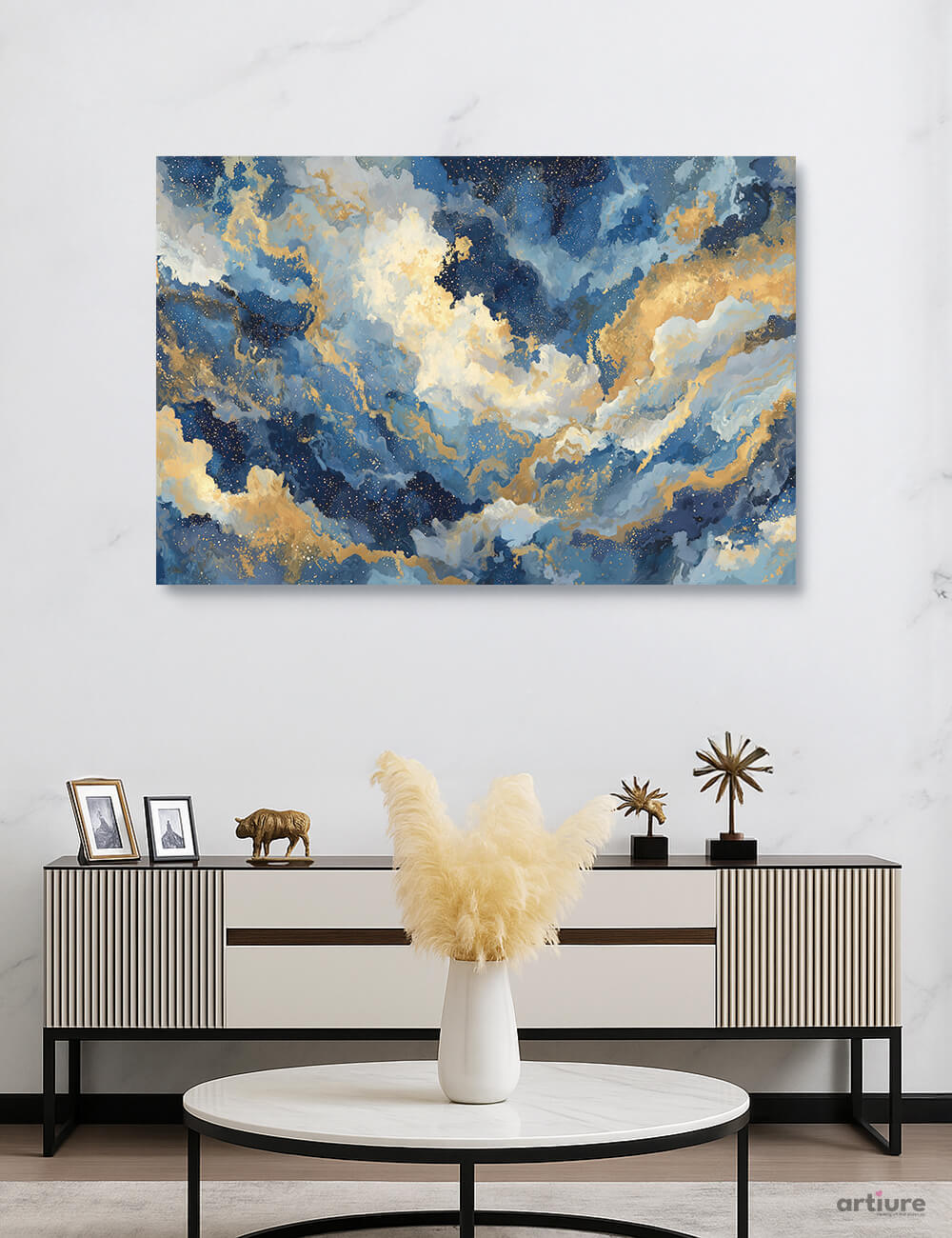 Rendered as an expansive canvas print, this piece invites the eye to drift through a vortex of blue harmonies—navy depths, azure swirls, and pale whites—punctuated by metallic gold accents. The brushwork reads like windswept currents, layering cool and warm tones to create depth and motion. Its abstract terrain evokes a cloudscape suspended between night and day, offering serenity and drama in equal measure. Set above a sleek sideboard, the artwork anchors modern interiors with a luxe, tranquil energy, complementing both neutral palettes and bold contrasts. The shimmering gold flecks catch light from different angles, lending a subtle sophistication to living rooms, bedrooms, or creative spaces.