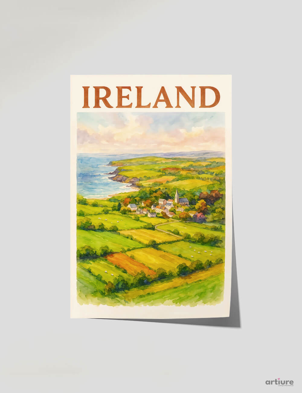 This serene poster captures the rural charm of Ireland’s countryside with rolling green fields, patchwork farmland, and a cozy village nestled by the sea. The soft brushstrokes and pastel palette evoke the island’s poetic beauty, making it a perfect piece for nature lovers and admirers of coastal tranquility.
