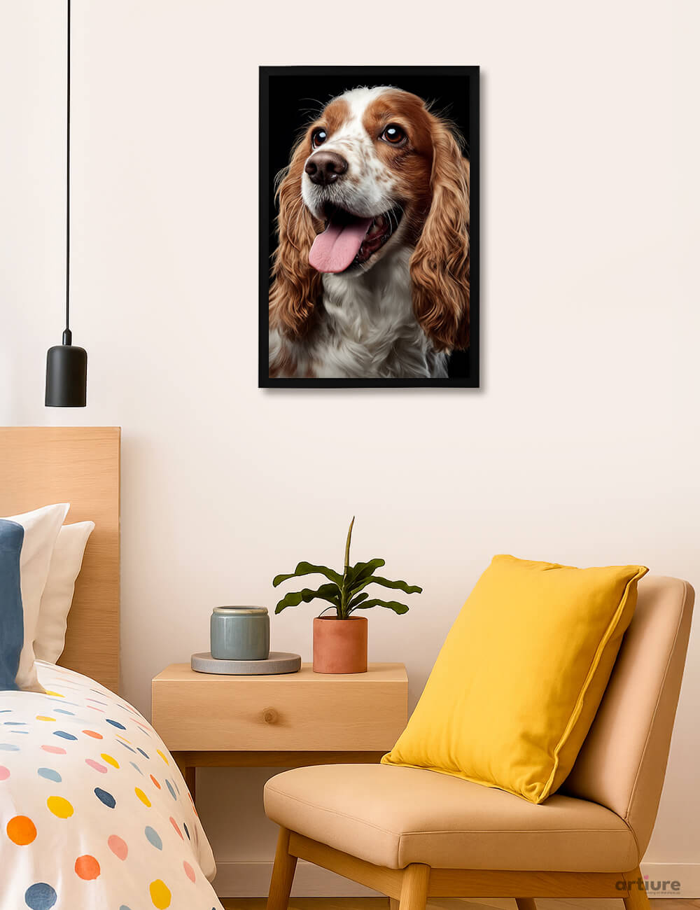 This photorealistic portrait captures a happy Cocker Spaniel with a glossy coat, framed in a sleek black border and mounted on a soft beige wall. The image exudes warmth and approachability, making it a versatile print for contemporary bedrooms or living nooks. The detailed fur, bright eyes, and tongue in playful arc convey a lively character while the restrained palette keeps the composition refined. Pair it with natural wood tones, muted textiles, and the occasional pop of yellow to create a cozy, welcoming vignette. Ideal for pet lovers and art enthusiasts alike, this art print offers a modern, easily styled focal point that elevates everyday spaces.