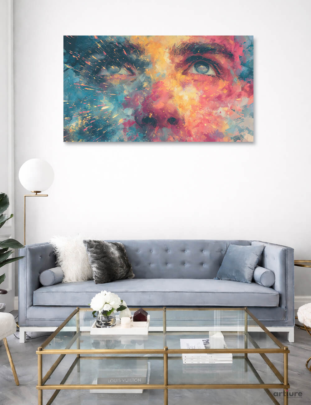 An electrifying abstract portrait blooms across the canvas, where teal and blue collide with orange, pink, and yellow in fevered brushstrokes. The suggested face dissolves into bursts of pigment, while the upward gaze anchors the composition with tension and wonder. Printed on premium canvas, the piece captures the push and pull between form and color, inviting viewers to linger as color showers ripple across the surface. The palette feels radiant and optimistic, brightening modern living spaces without overwhelming them. This work makes a confident focal point in contemporary interiors, pairing well with muted furniture and metallic accents while adding kinetic energy to a calm, airy room.