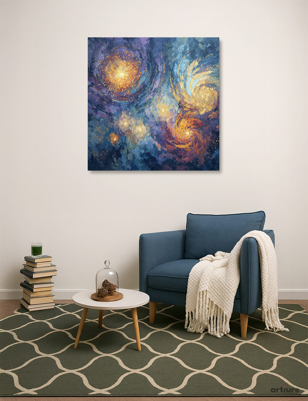 An AI-generated abstract canvas prints kinetic galaxies of indigo, violet, and molten gold. The composition spirals outward with textured strokes, suggesting cosmic motion and luminous energy. Deep blues anchor the scene while warm yellows and oranges orbit the centers, creating a balanced contrast that catches the eye without overpowering a room. Designed for contemporary living spaces, this piece invites reflection and conversation, pairing well with neutral furniture and soft lighting. The canvas finish adds subtle depth, enhancing brushwork and speckled highlights. Ideal for wall displays in lounges, study corners, or entryways seeking a refined, modern focal point that elevates everyday interiors.